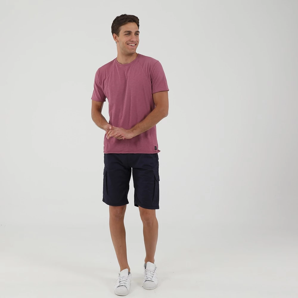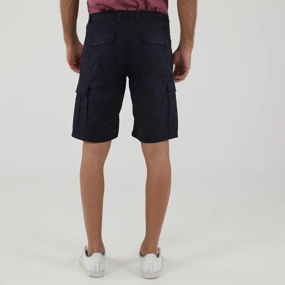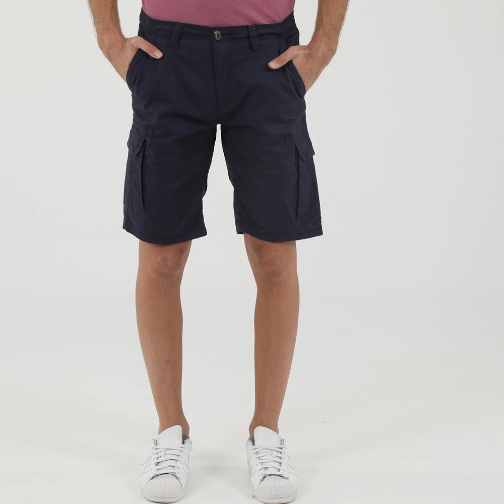 Ανδρική cargo βερμούδα OCEAN SHARK σε σκούρα μπλε απόχρωση. Είναι σε ίσια γραμμή, διαθέτει τσέπες με καπάκι στα πλαϊνά και πίσω και κλείνει με κουμπί και φερμουάρ μπροστά.