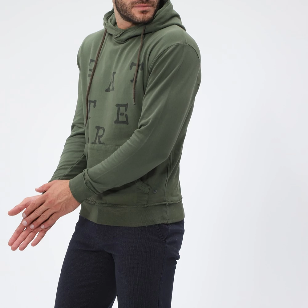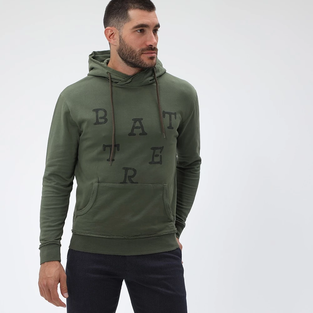Ανδρική φούτερ μπλούζα BATTERY σε χακί απόχρωση με στάμπα μπροστά. Σε ίσια γραμμή, από βαμβακερή σύνθεση. Διαθέτει κουκούλα με κορδόνι και τσέπη καγκουρό μπροστά. Λάστιχο ριμπ στις μανσέτες και στην βάση.