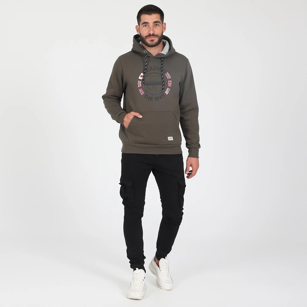 Ανδρική φούτερ μπλούζα CATAMARAN SAILWEAR σε χακί απόχρωση, με στάμπα μπροστά. Σε ίσια γραμμή, με μακριά μανίκια και στρογγυλή λαιμόκοψη. Διαθέτει κουκούλα με κορδόνι και τσέπη καγκουρό.