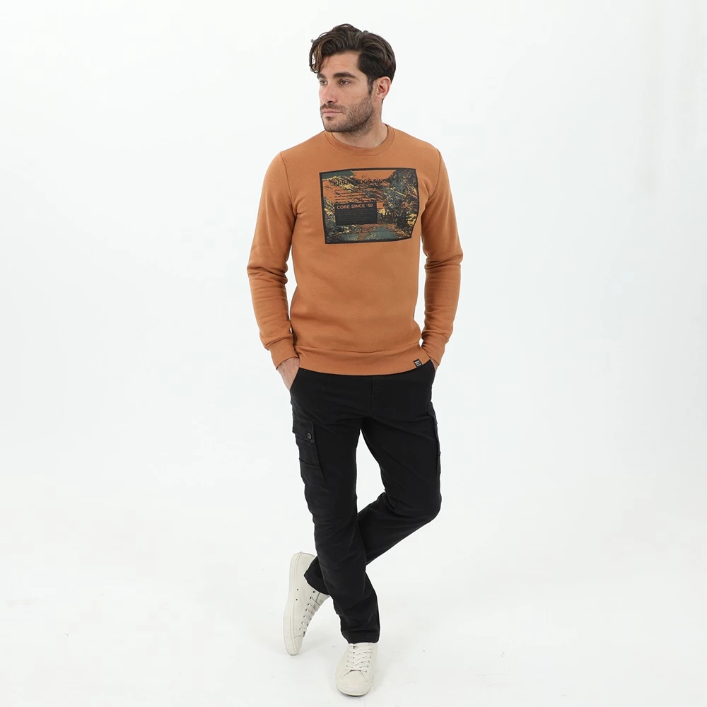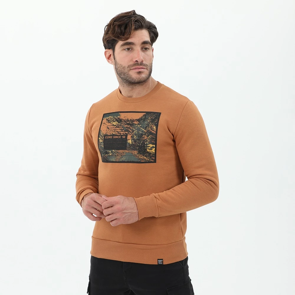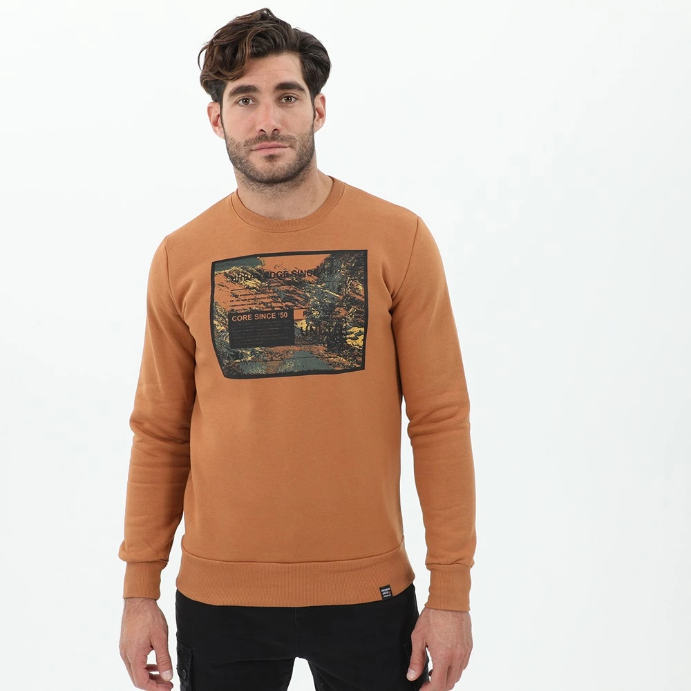 Ανδρική φούτερ μπλούζα CATAMARAN SAILWEAR σε πορτοκαλί ταμπά απόχρωση, με στάμπα μπροστά. Σε ίσια γραμμή, με μακριά μανίκια και στρογγυλή λαιμόκοψη.