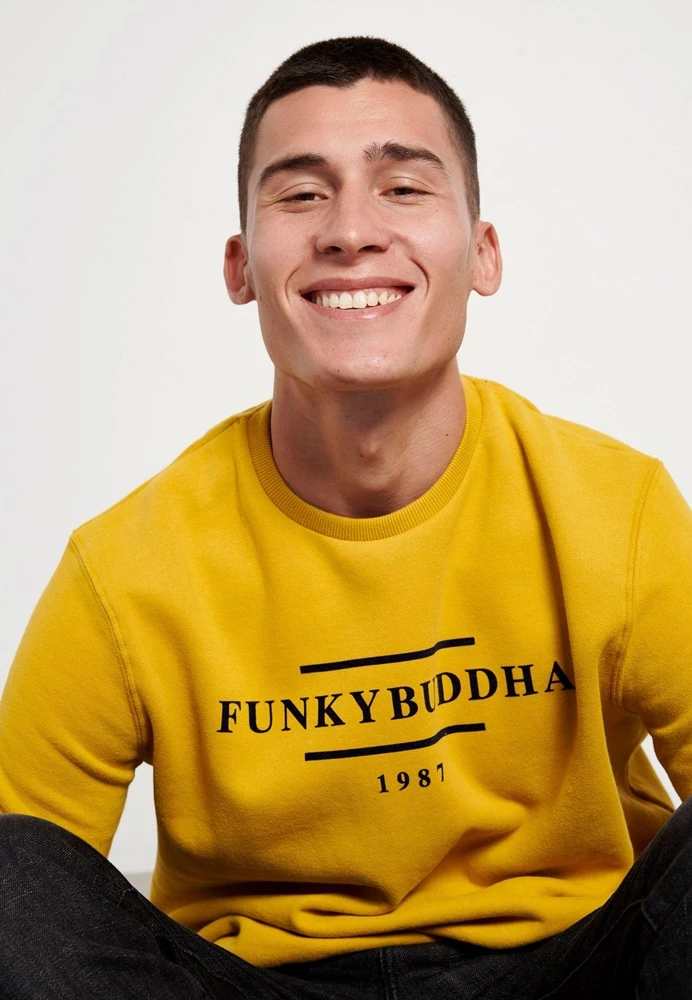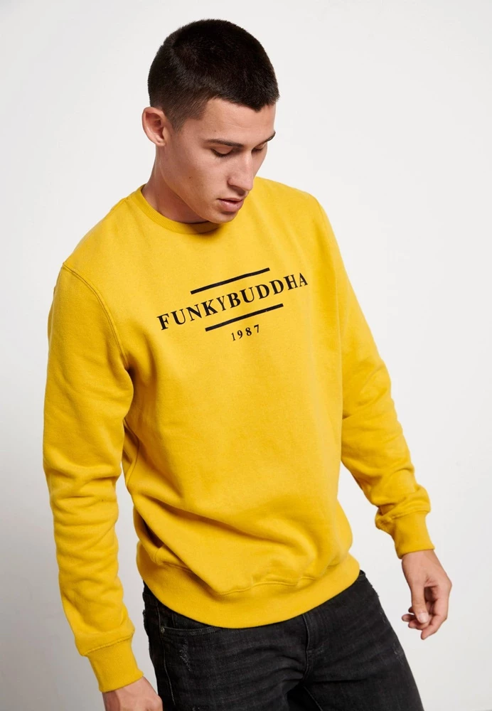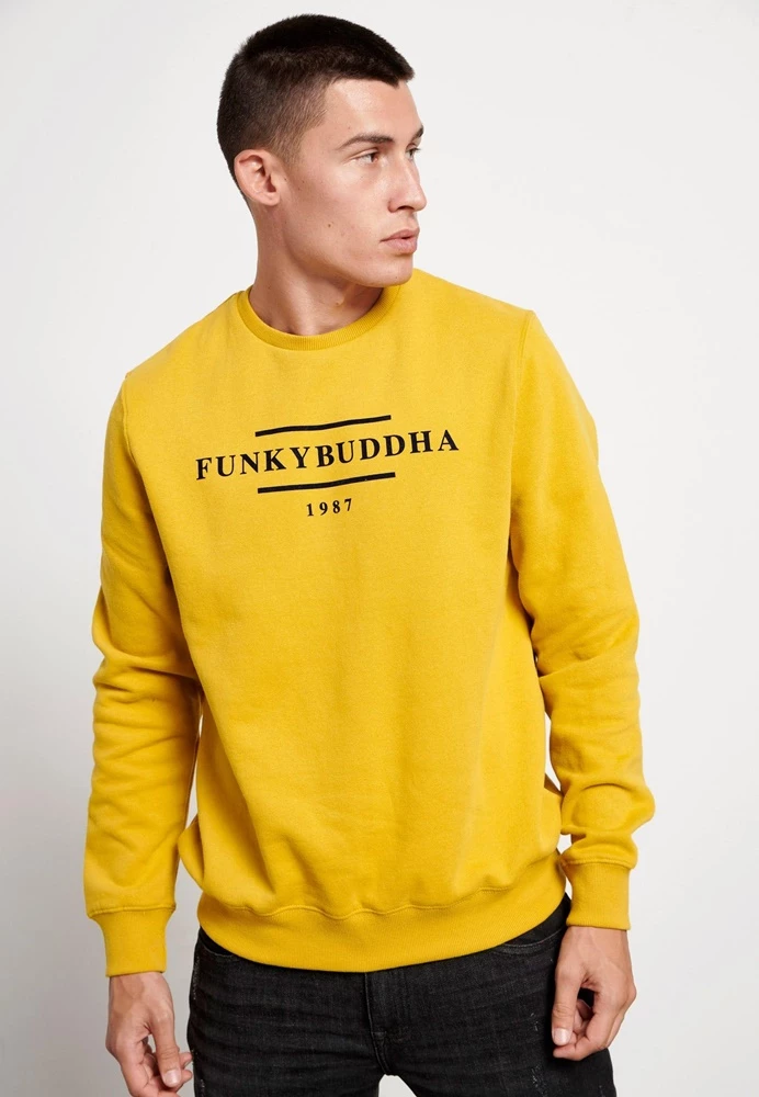 Ανδρική φούτερ μπλούζα FUNKY BUDDHA σε κίτρινο χρώμα, με κεντημένο logo στο στήθος. Έχει στρογγυλή λαιμόκοψη, μακριά μανίκια και τελειώματα με πλέξη Rib.