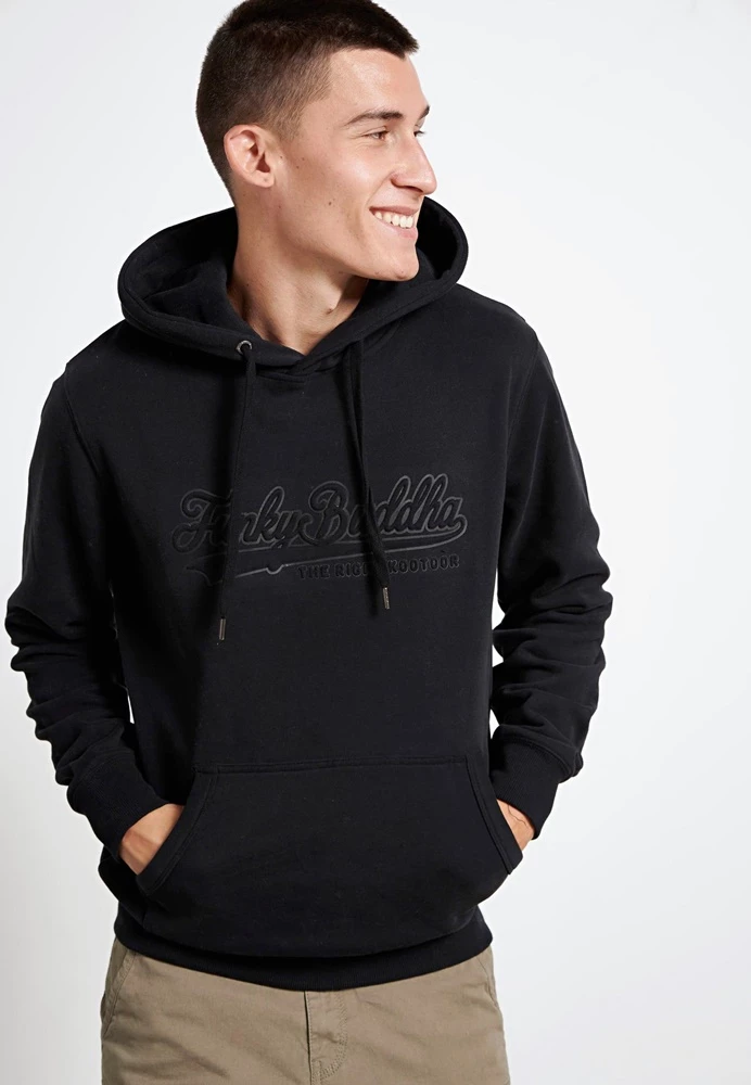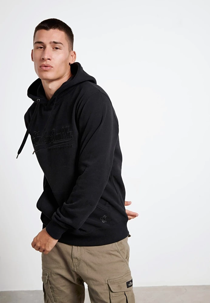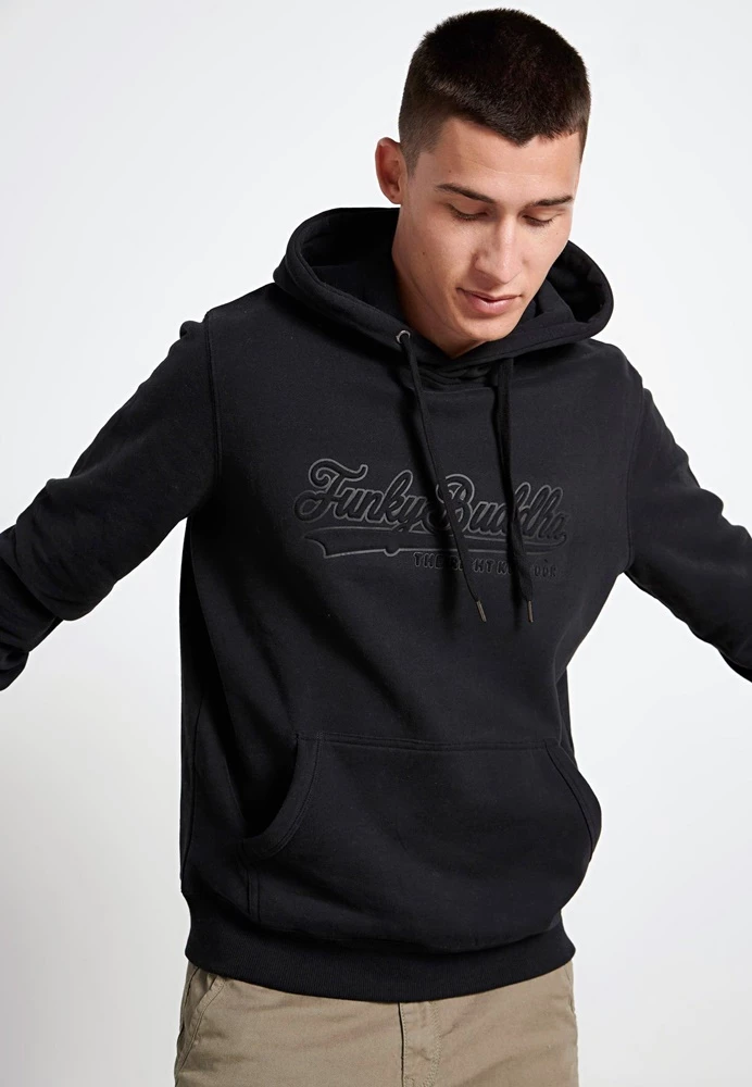 Ανδρική φούτερ μπλούζα FUNKY BUDDHA σε μαύρο χρώμα με embossed τύπωμα. Κουκούλα με ενσωματωμένο κορδόνι. Μπροστινή τσέπη,3 D Funky Buddha logo στο στηθος,Τελειώματα με πλέξη Rib.