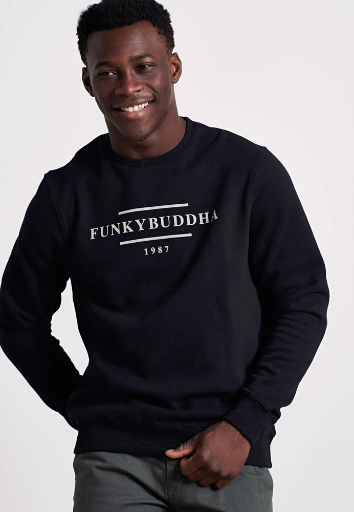 Ανδρική φούτερ μπλούζα FUNKY BUDDHA σε μαύρο χρώμα, με κεντημένο logo στο στήθος. Έχει στρογγυλή λαιμόκοψη, μακριά μανίκια και τελειώματα με πλέξη Rib.