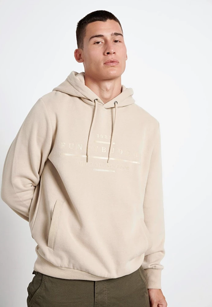 Ανδρική φούτερ μπλούζα FUNKY BUDDHA σε μπεζ χρώμα με κουκούλα και ενσωματωμένο κορδόνι. Διαθέτει μπροστινή τσέπη,Funky Buddha κεντημένο λογότυπο και τελειώματα με πλέξη Rib.