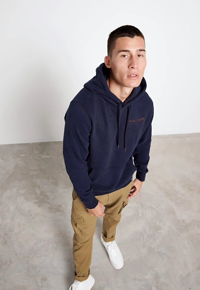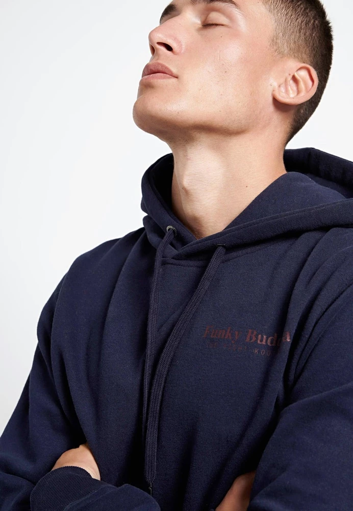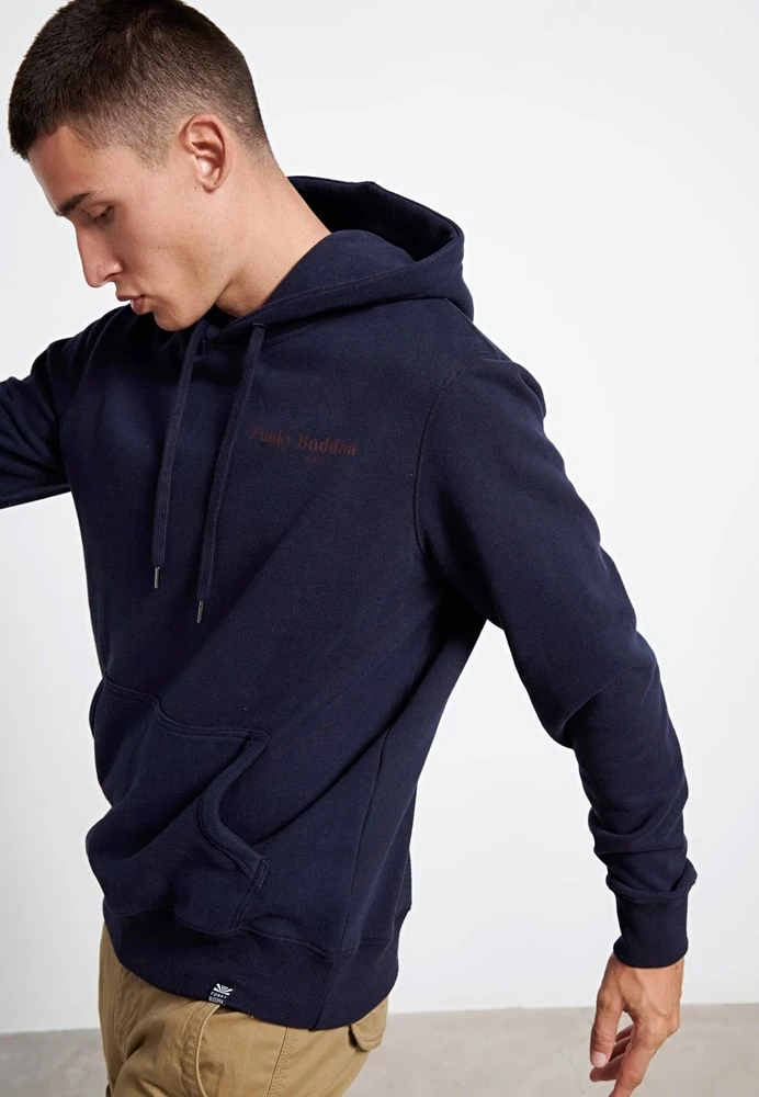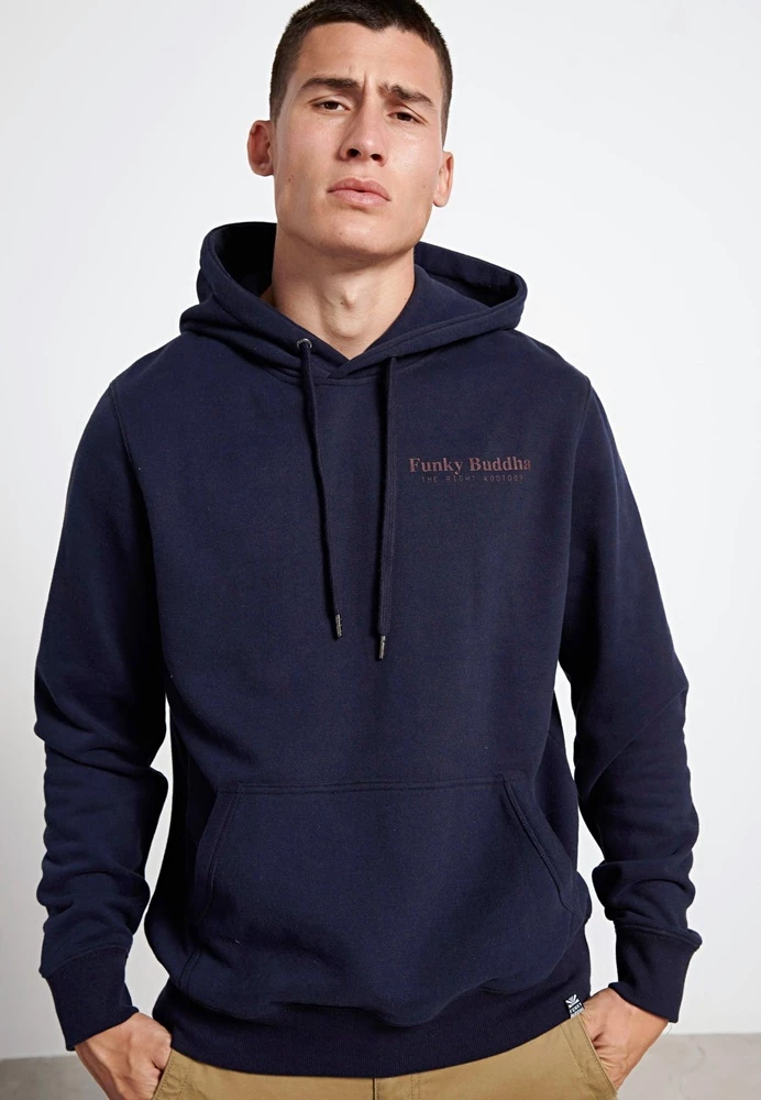 Ανδρική φούτερ μπλούζα FUNKY BUDDHA σε μπλε χρώμα, με τυπωμένο logo στο στήθος. Διαθέτει κουκούλα με ενσωματωμένο κορδόνι, μπροστινή τσέπη και τελειώματα με πλέξη Rib.