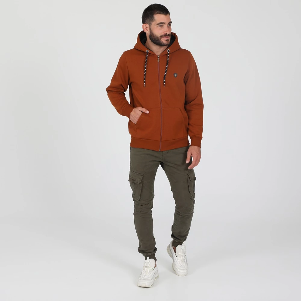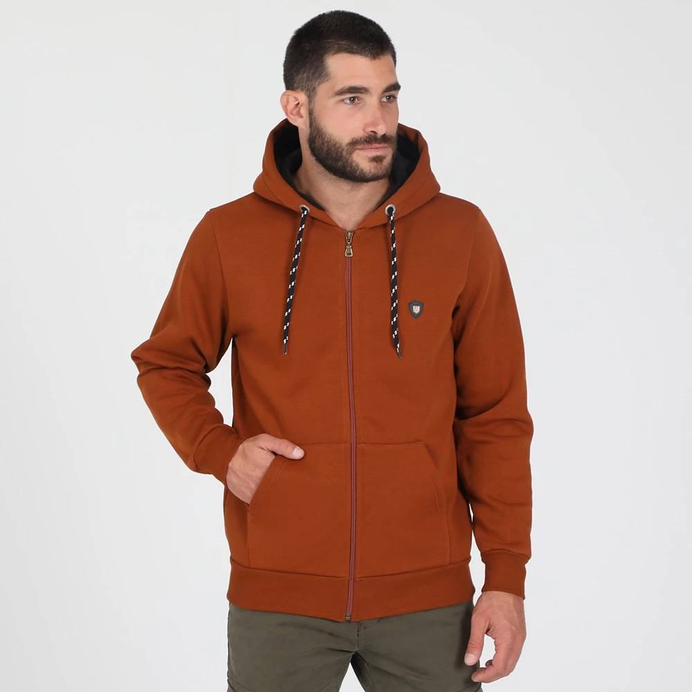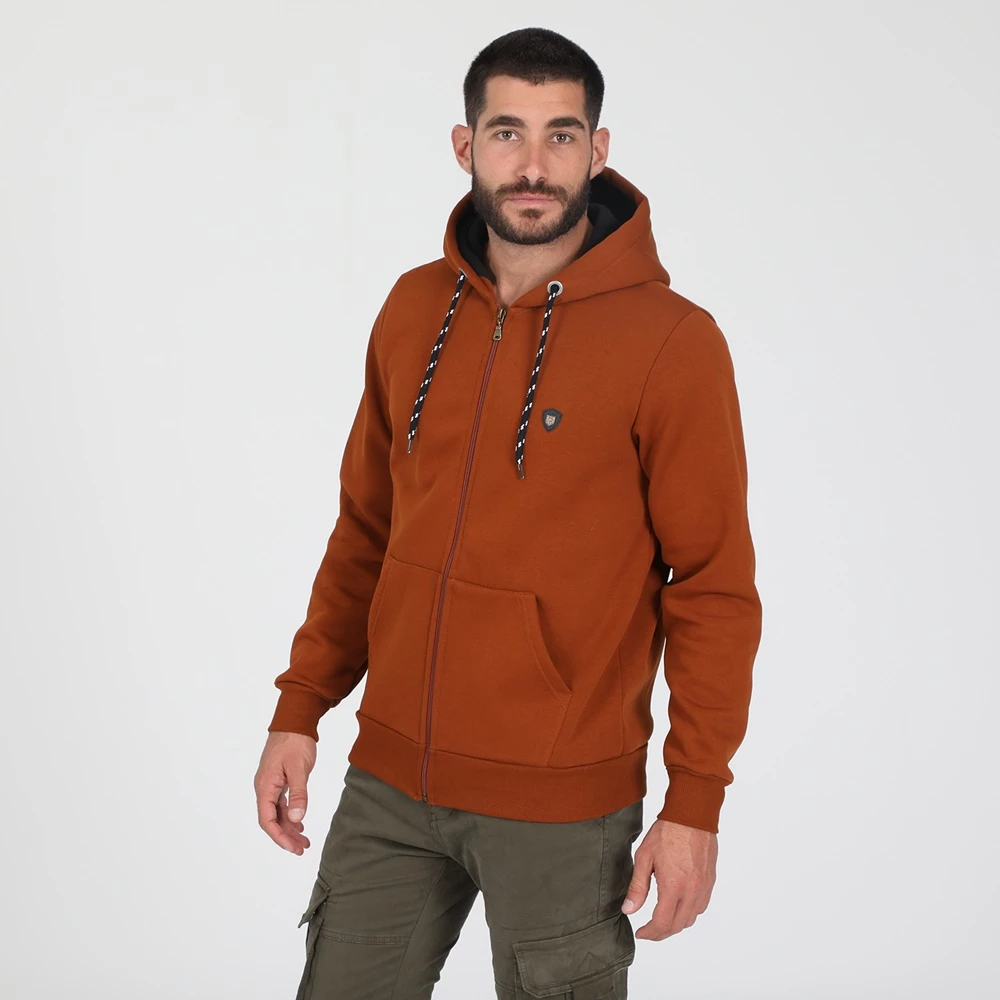 Ανδρική φούτερ ζακέτα CATAMARAN SAILWEAR σε καφέ-πορτοκαλί απόχρωση. Σε ίσια γραμμή, με μακριά μανίκια και στρογγυλή λαιμόκοψη. Διαθέτει κουκούλα με κορδόνι και δύο τσέπες μπροστά. Κλείνει με φερμουάρ μπροστά.