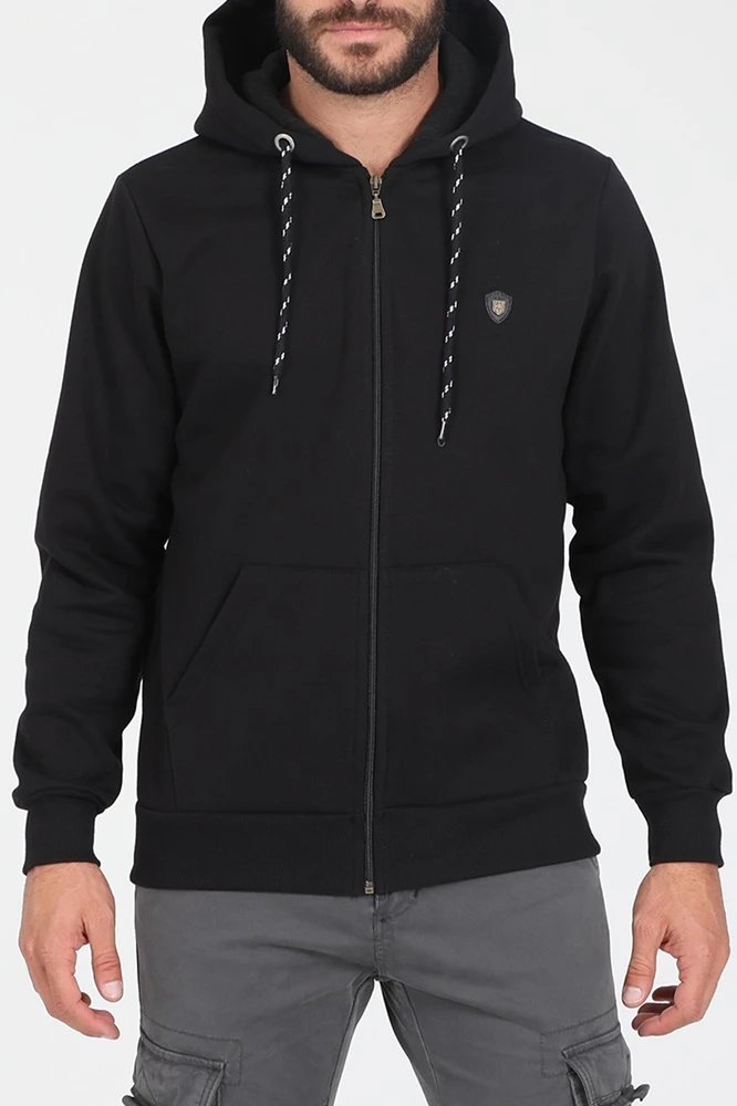 Ανδρική φούτερ ζακέτα CATAMARAN SAILWEAR σε μαύρο χρώμα. Σε ίσια γραμμή, με μακριά μανίκια και στρογγυλή λαιμόκοψη. Διαθέτει κουκούλα με κορδόνι και δύο τσέπες μπροστά. Κλείνει με φερμουάρ.