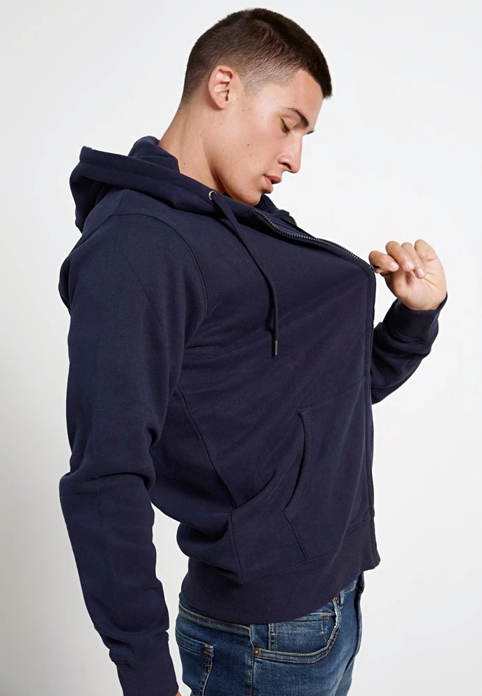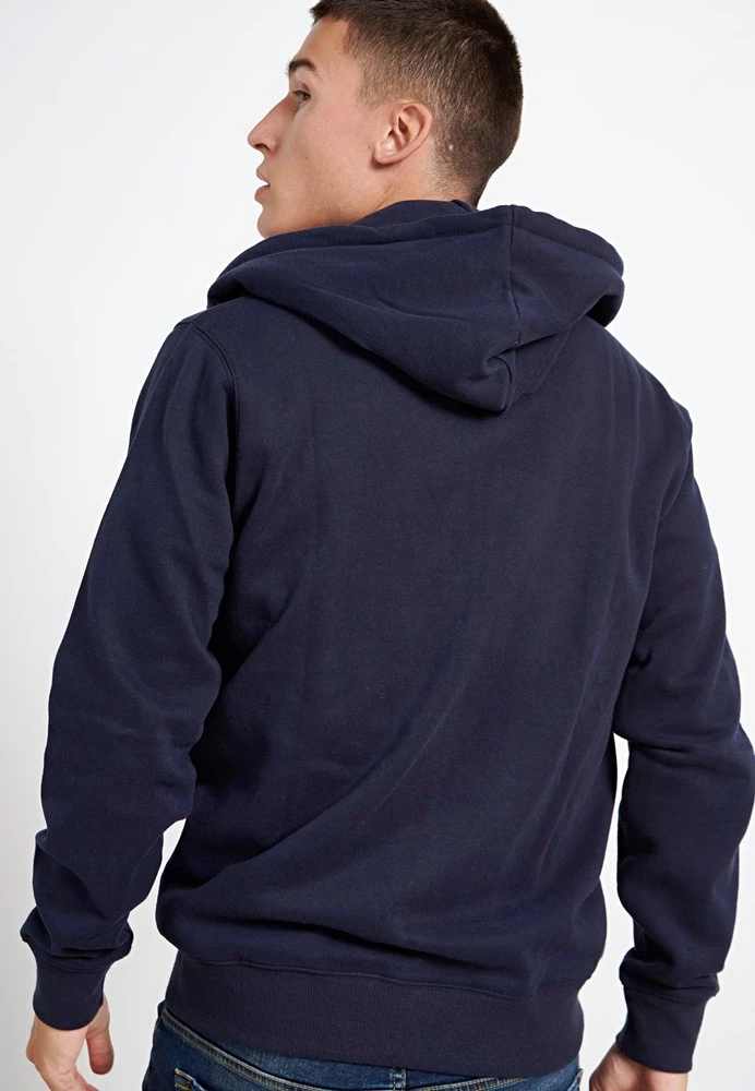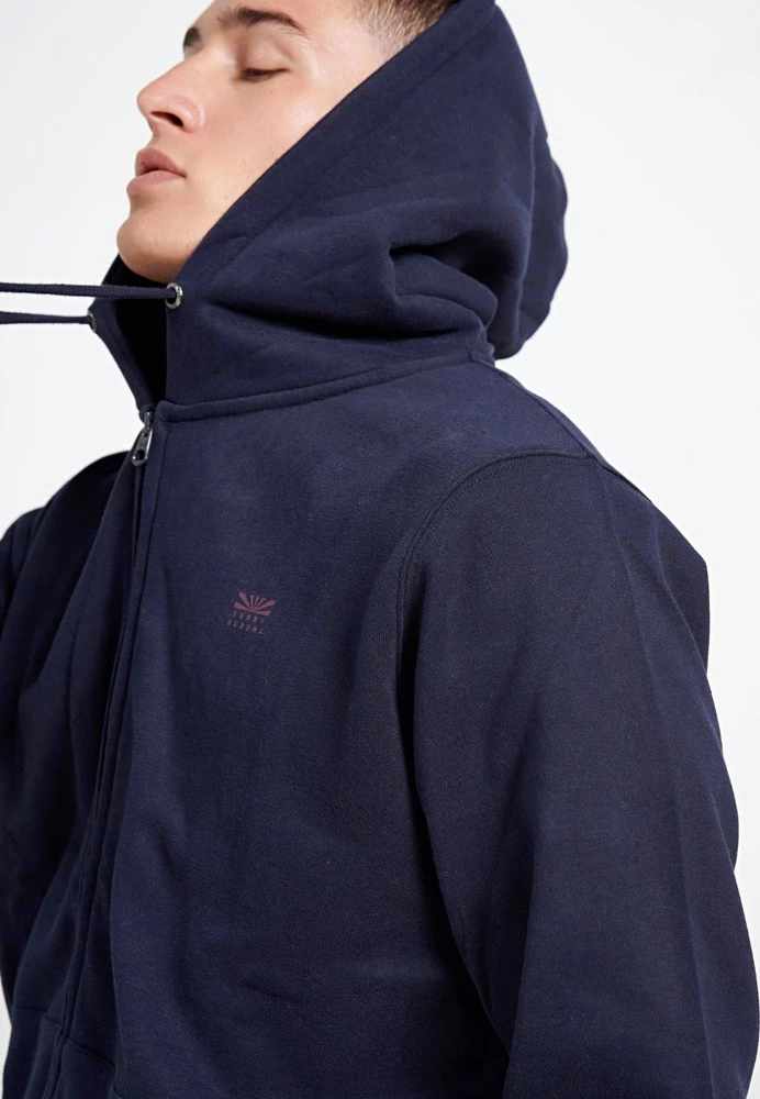 Ανδρική φούτερ ζακέτα FUNKY BUDDHA σε σκούρη μπλε απόχρωση, με κεντημένο logo στο στήθος. Από βαμβακερή σύνθεση, με μακριά μανίκια και στρογγυλή λαιμόκοψη, Διαθέτει κουκούλα με κορδόνι, δύο τσέπες στα πλάγια και λάστιχο rib στα τελειώματα. Κλείνει με φερμουάρ.