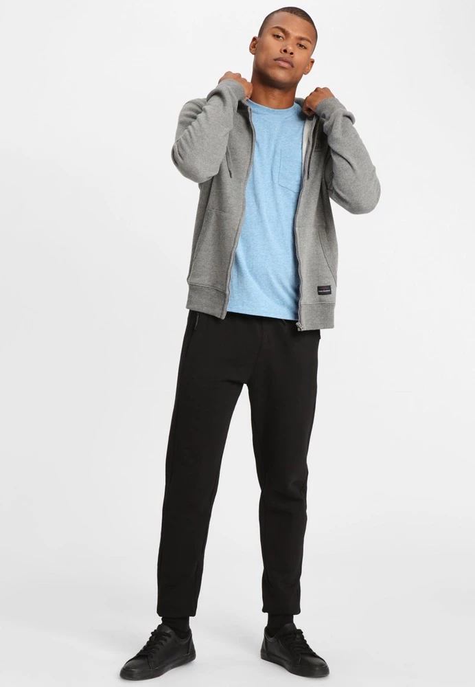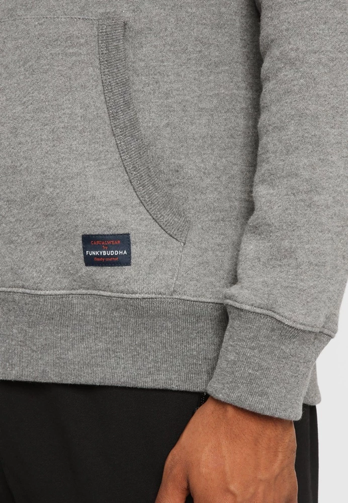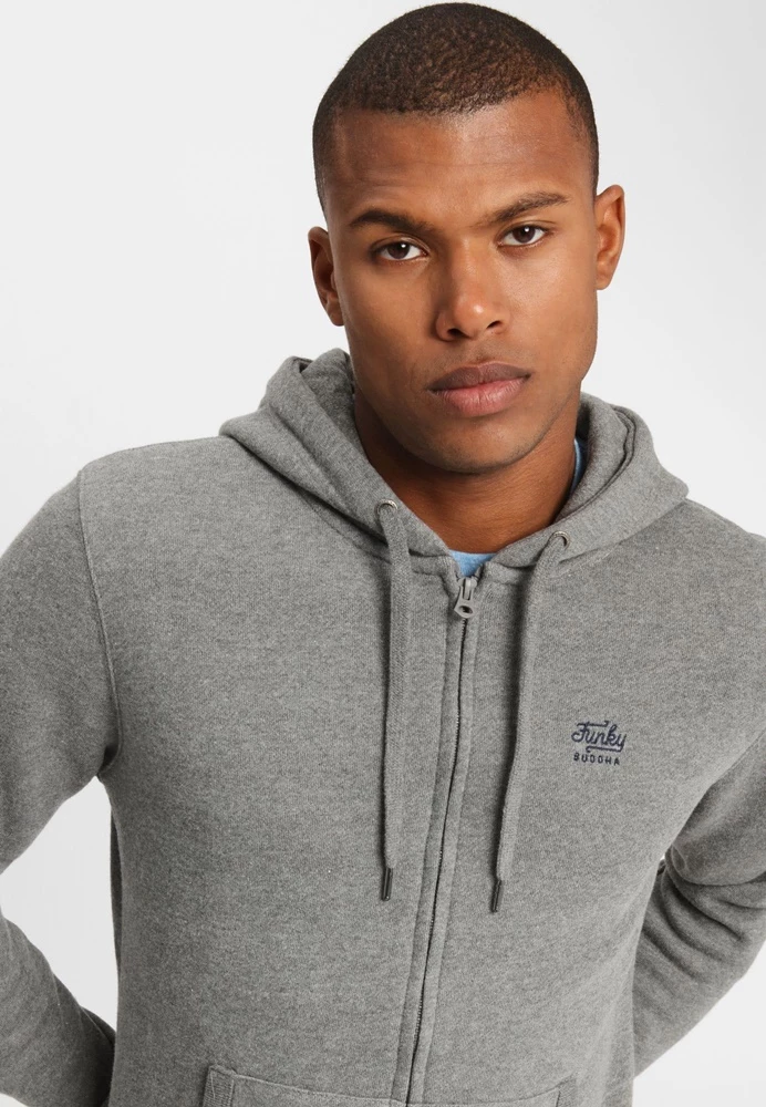 Ανδρική φούτερ ζακέτα FUNKY BUDDHA σε γκρι απόχρωση. Σε ίσια γραμμή, με μακριά μανίκια και στρογγυλή λαιμόκοψη. Διαθέτει κουκούλα με κορδόνι, δύο τσέπες στα πλάγια και κλείνει με φερμουάρ μπροστά. Λάστιχο rib στις μανσέτες και στην βαση.