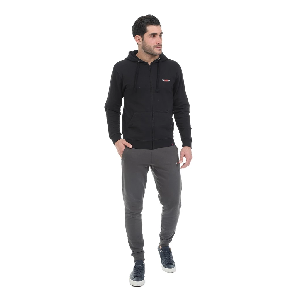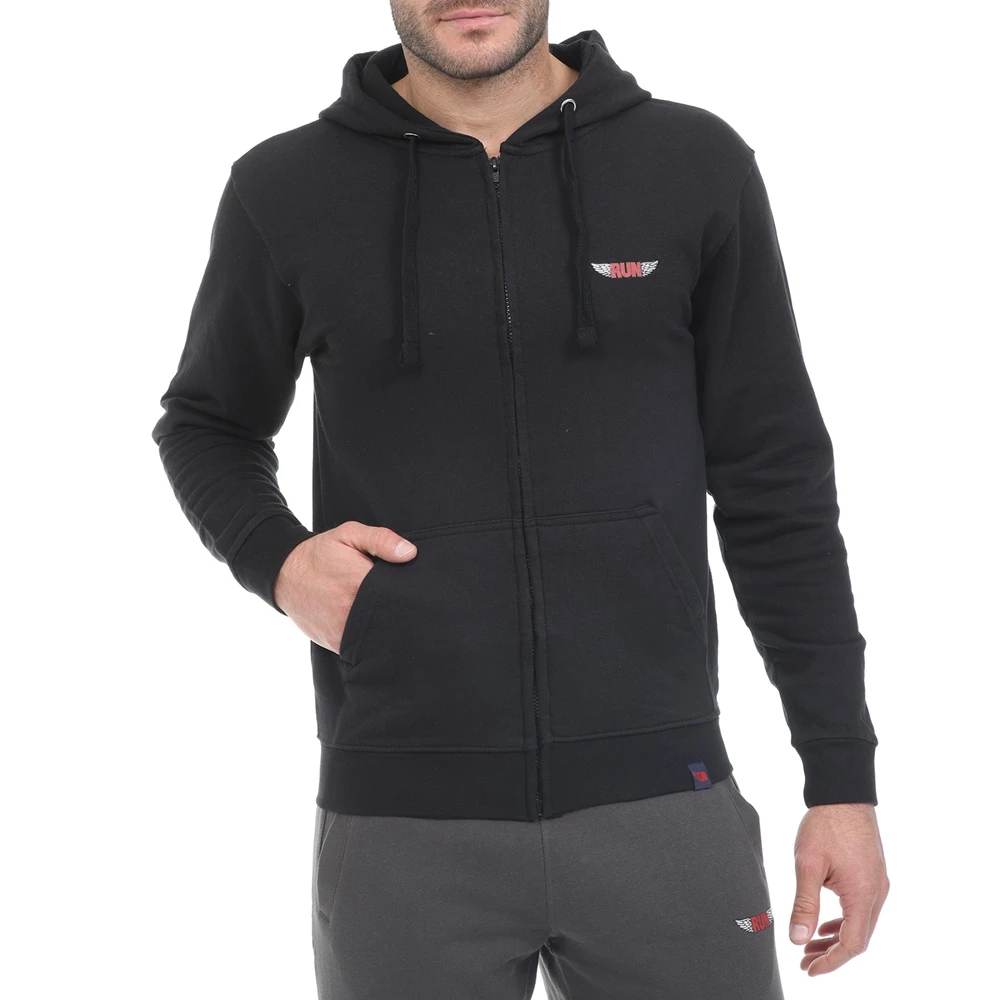 Ανδρική φούτερ ζακέτα RUN σε μαύρο χρώμα, με κεντημένο λογότυπο στο στήθος. Από βαμβακερή σύνθεση, σε ίσια γραμμή. Με μακριά μανίκια και στρογγυλή λαιμόκοψη. Διαθέτει κουκούλα με κορδόνι, δύο τσέπες στα πλάγια και λάστιχο ριμπ στις μανσέτες και την βάση. Κλείνει με φερμουάρ μπροστά.