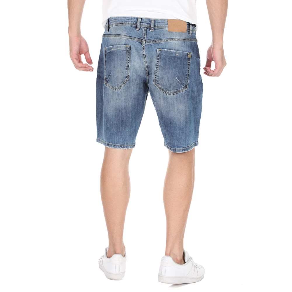Ανδρική jean βερμούδα SSEINSE σε μπλε απόχρωση. Από βαμβακερό denim, σε ίσια γραμμή. Δαθέτει δύο τσέπες στα πλάγια και δύο τσέπες πίσω. Θηλάκια για ζώνη στη μέση και δερμάτινη ετικέτα με το λογότυπο. Κλείνει με κουμπί και φερμουάρ μπροστά.