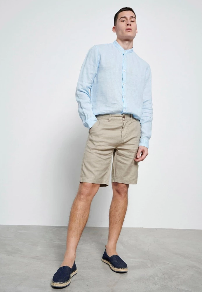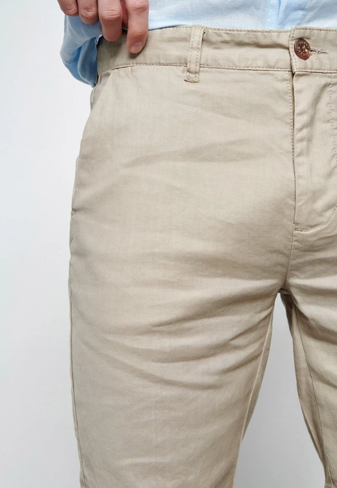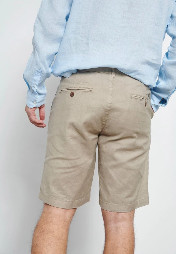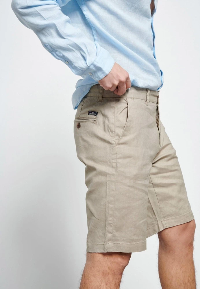 Ανδρική λινή βερμούδα FUNKY BUDDHA σε μπεζ απόχρωση. Σε στιλ chino, με κανονική εφαρμογή. Διαθέτει δύο μπροστινές και δύο πίσω τσέπες. Κλείνει με κουμπί και φερμουάρ μπροστά.