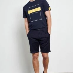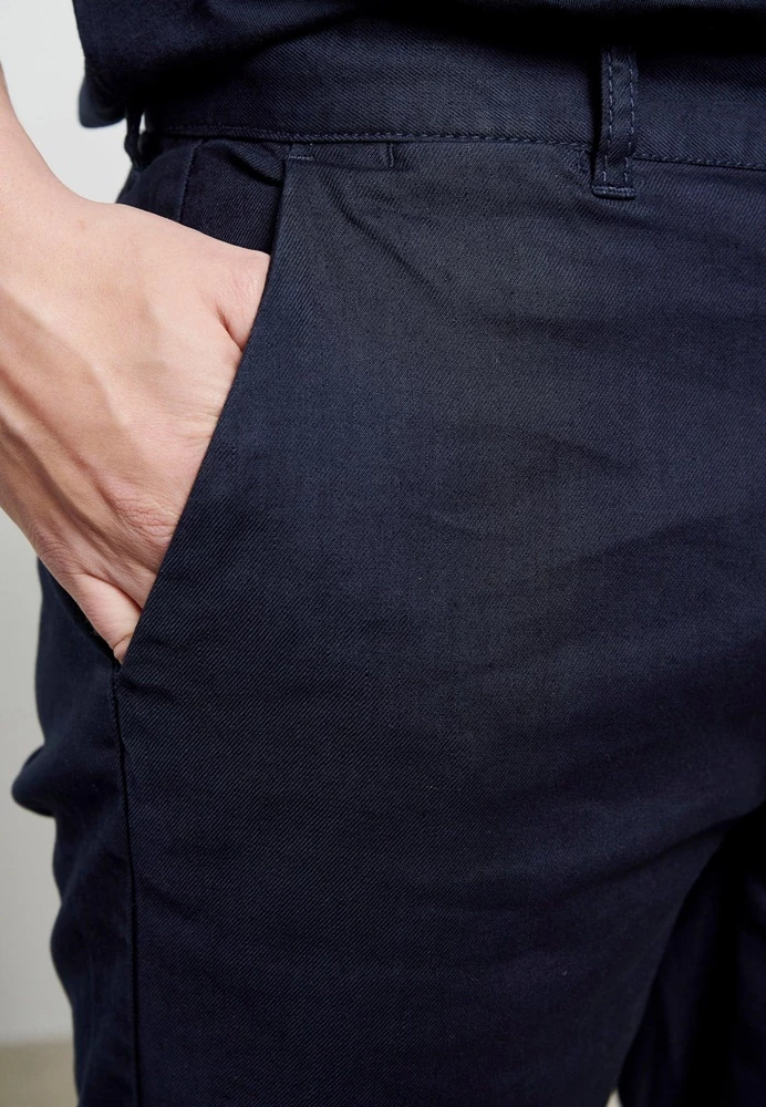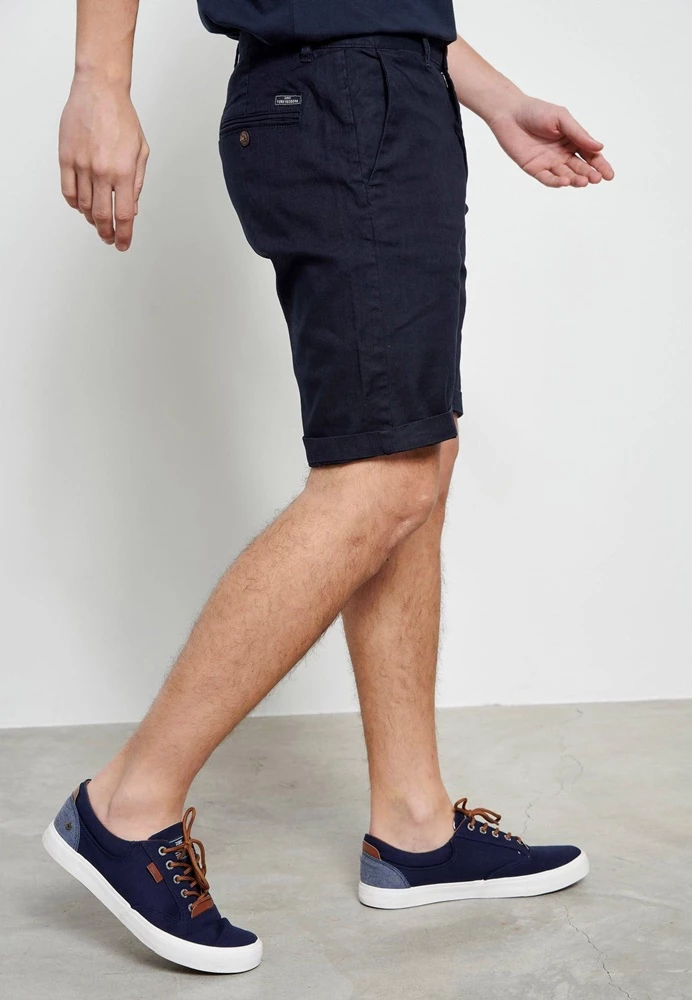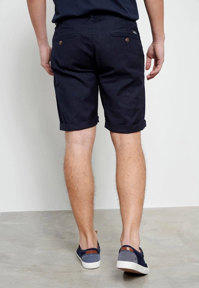 Ανδρική λινή βερμούδα FUNKY BUDDHA σε μπλε απόχρωση. Σε στιλ chino, με κανονική εφαρμογή. Διαθέτει δύο μπροστινές και δύο πίσω τσέπες. Κλείνει με κουμπί και φερμουάρ μπροστά.