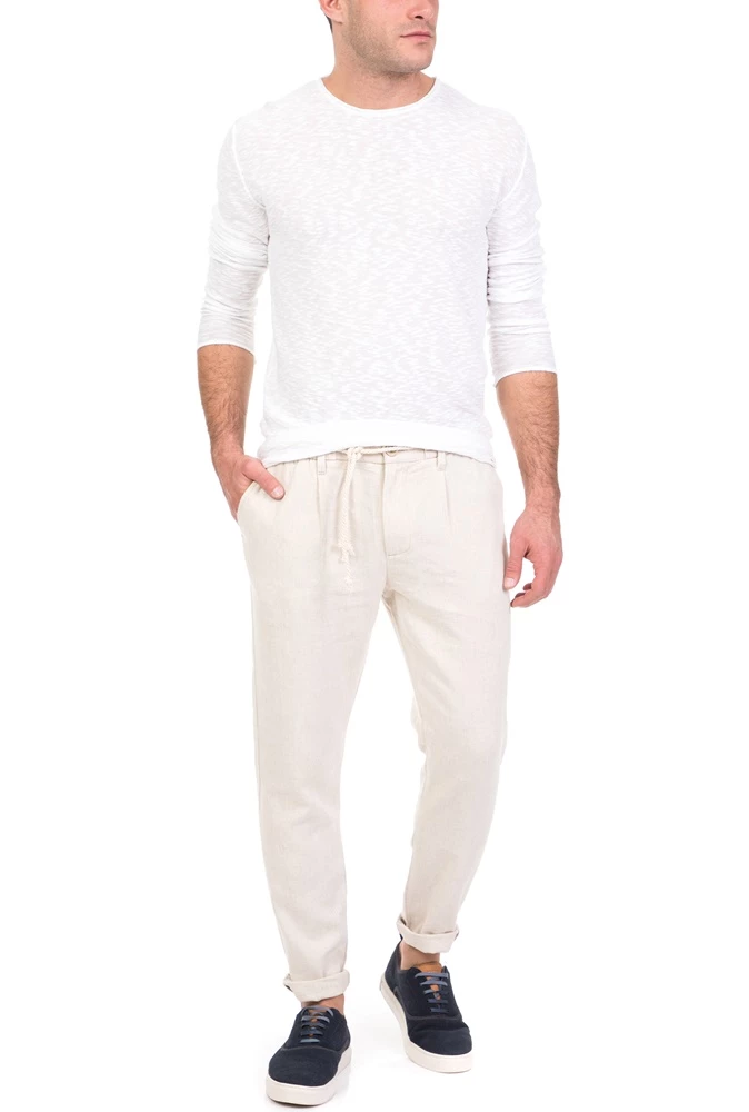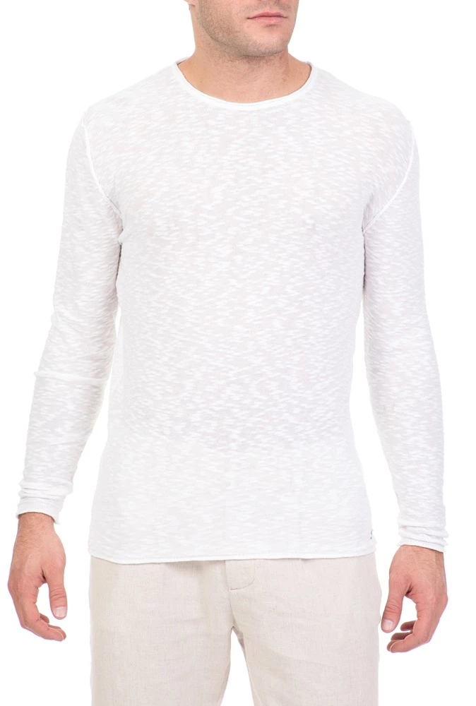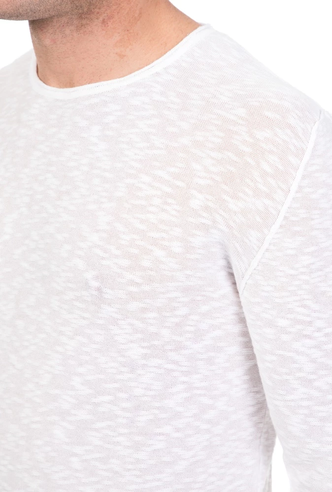 Ανδρική μακρυμάνικη μπλούζα σε λευκό χρώμα, φτιαγμένη από λεπτό ύφασμα. Έχει στενή γραμμή, στρογγυλή λαιμόκοψη και λεπτομέρεια στο πίσω μέρος. Ιδανική επιλογή για all day εμφανίσεις.