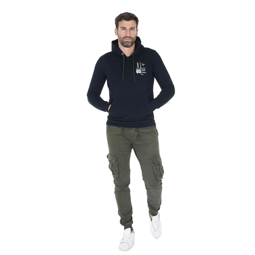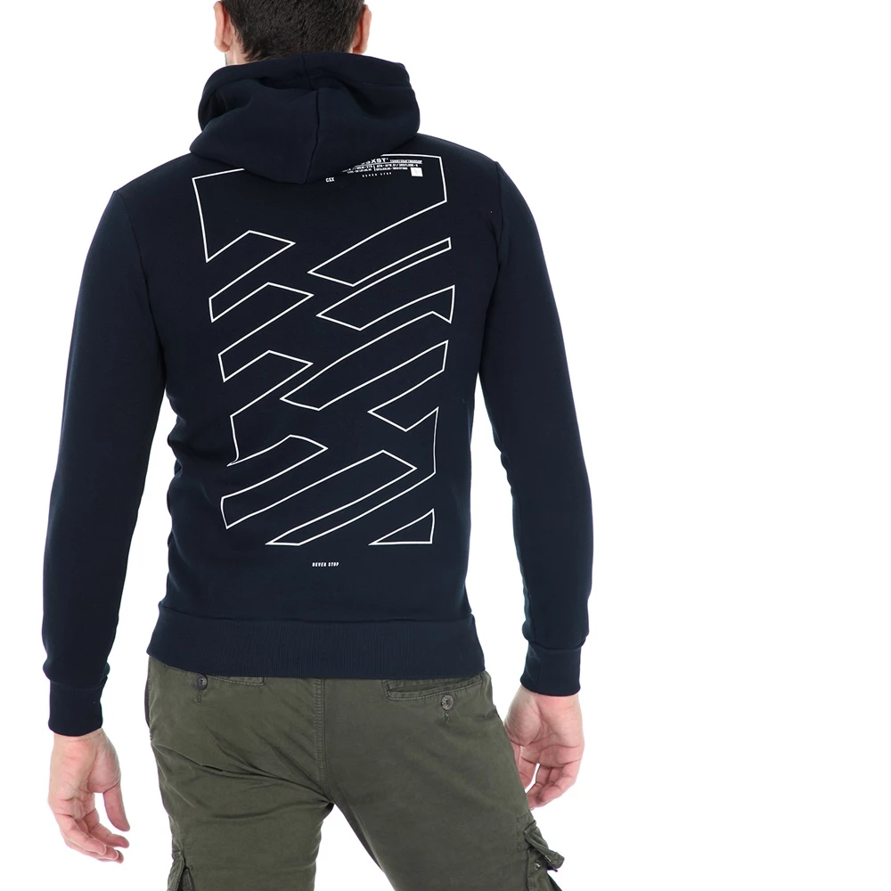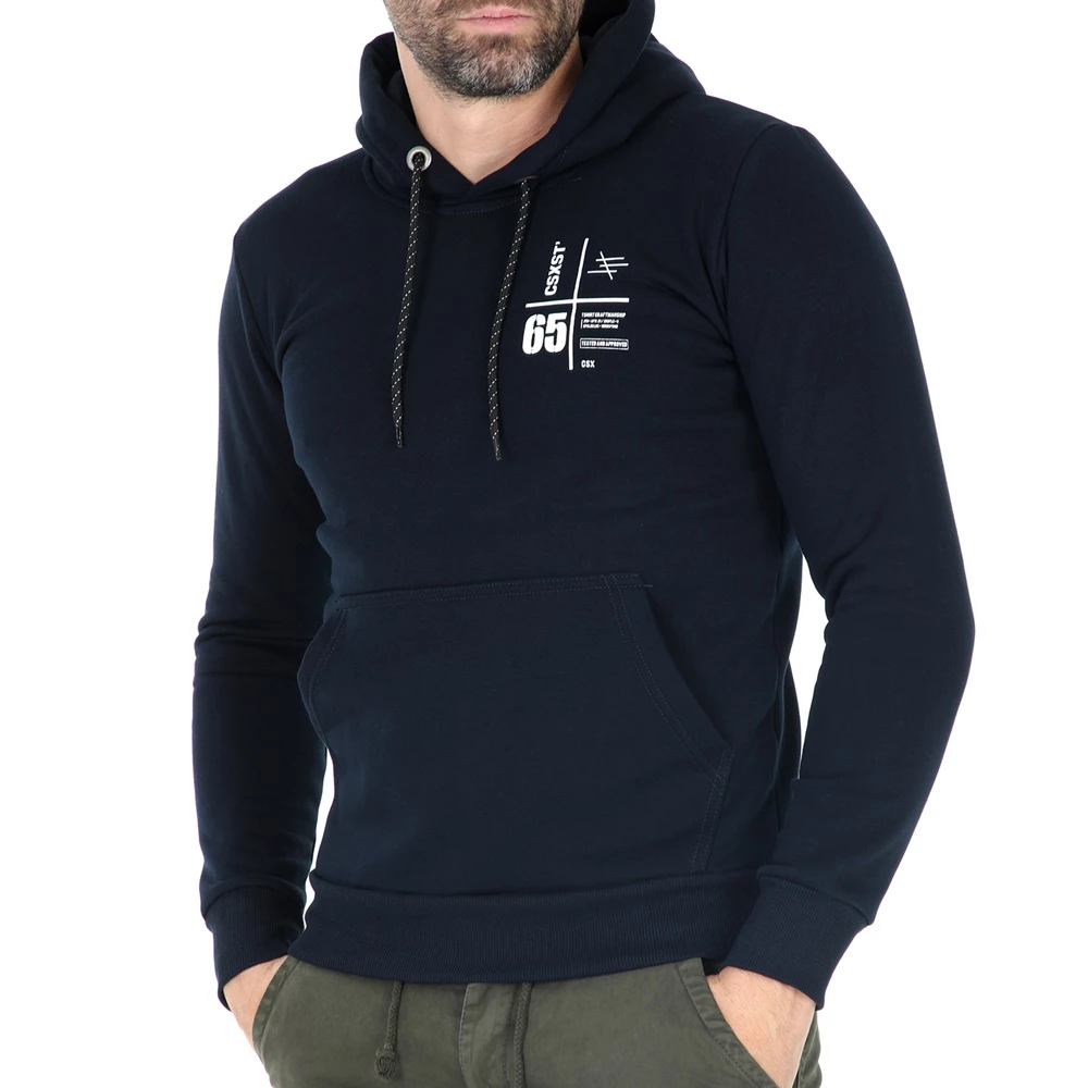 Ανδρική φούτερ μπλούζα με κουκούλα, σε μπλέ χρώμα. Έχει τύπωματα στο στήθος αριστερά και στην πλάτη. Θα τη συνδυάσεις με αθλητικές φόρμες ή τζιν παντελόνι για τις καθημερινές σου βόλτες.