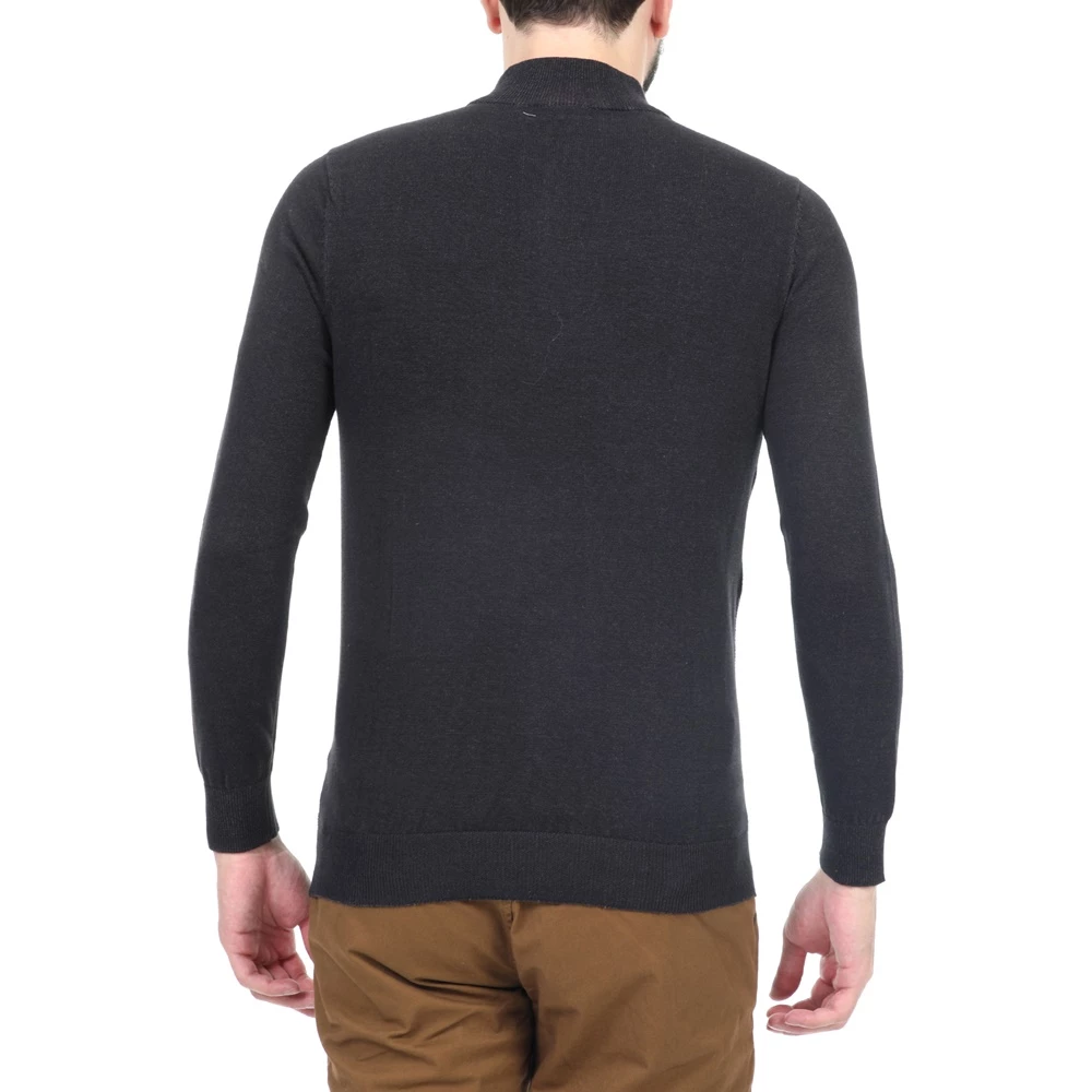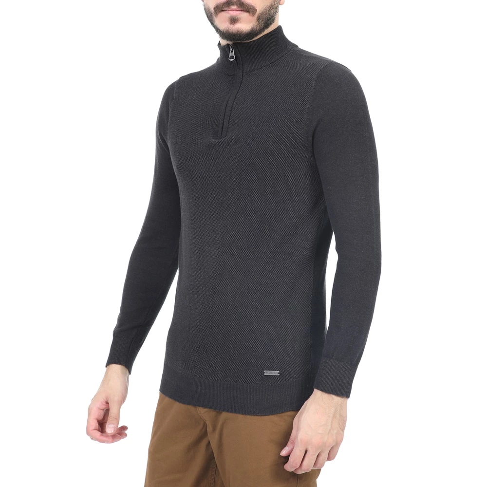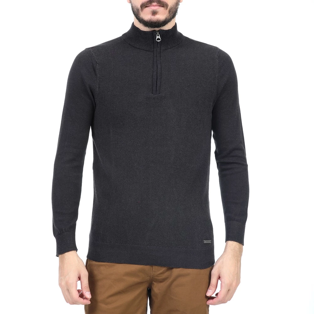 Ανδρική πλεκτή μπλούζα BATTERY σε μαύρο χρώμα. Σε ίσια γραμμή, από βαμβακερή σύνθεση, με ανάγλυφη ριγωτή πλέξη. Έχει μακριά μανίκια και όρθιο γιακά με φερμουάρ στην λαιμόκοψη. Λάστιχο ριμπ στη βάση και τις μανσέτες.