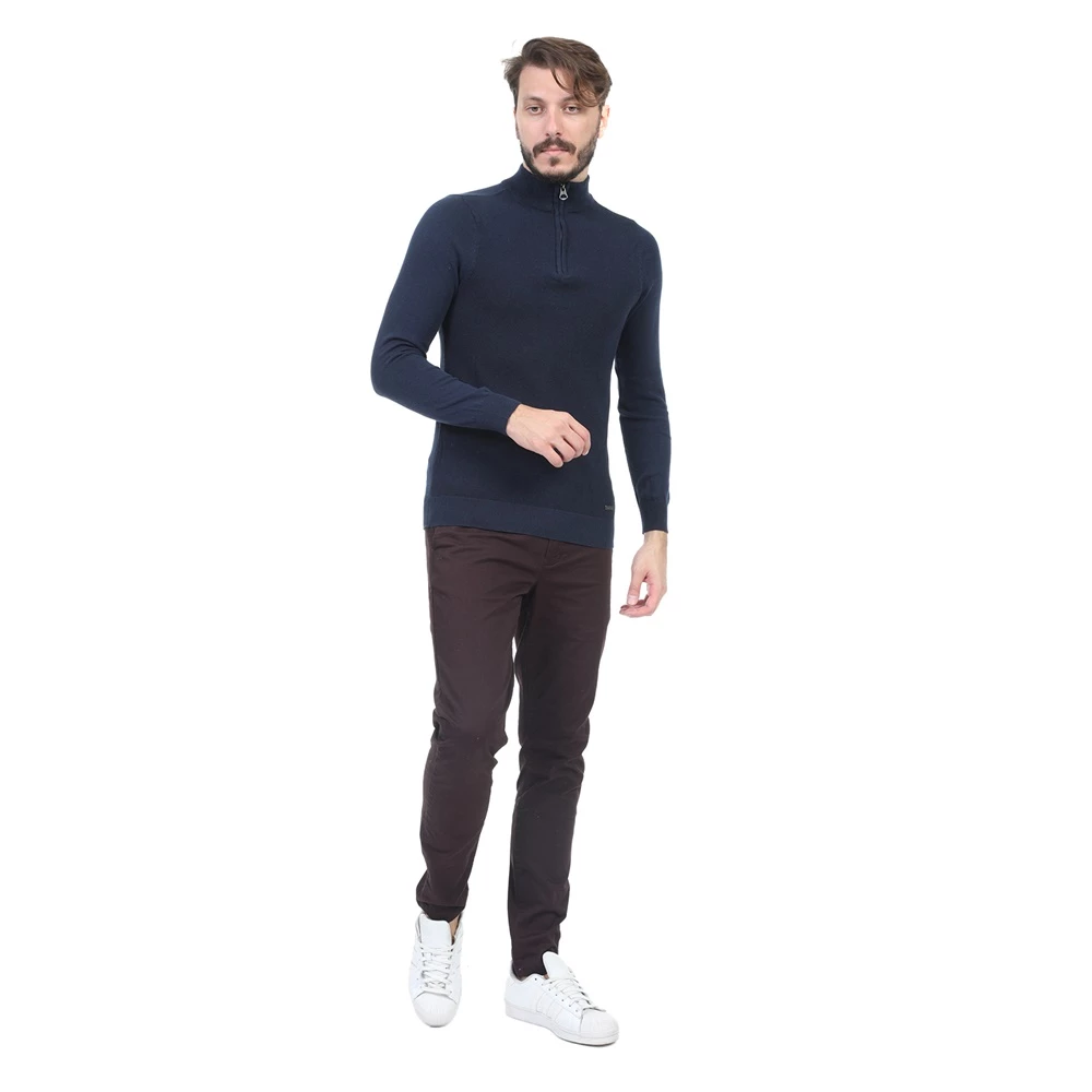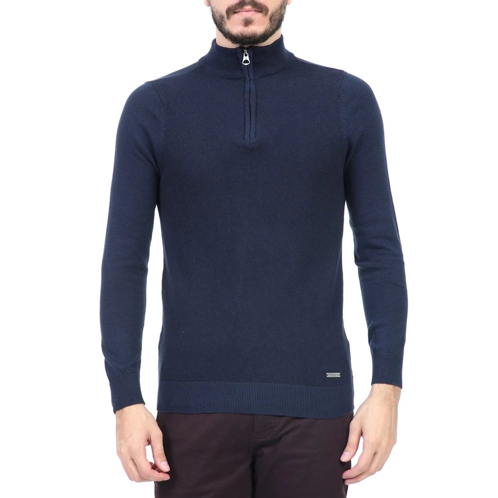 Ανδρική πλεκτή μπλούζα BATTERY σε μπλε απόχρωση. Σε ίσια γραμμή, από βαμβακερή σύνθεση, με ανάγλυφη ριγωτή πλέξη. Έχει μακριά μανίκια και όρθιο γιακά με φερμουάρ στην λαιμόκοψη. Λάστιχο ριμπ στη βάση και τις μανσέτες.