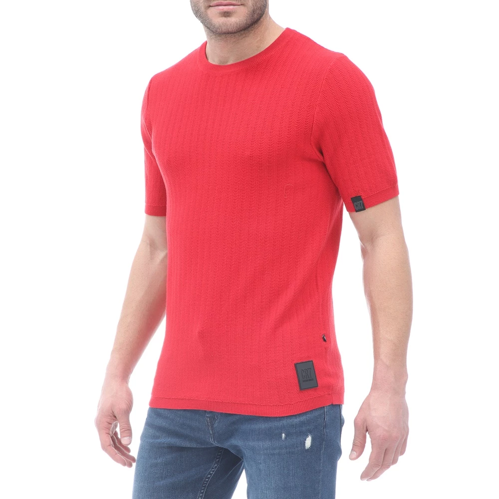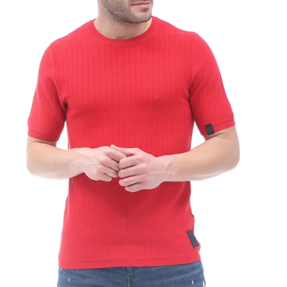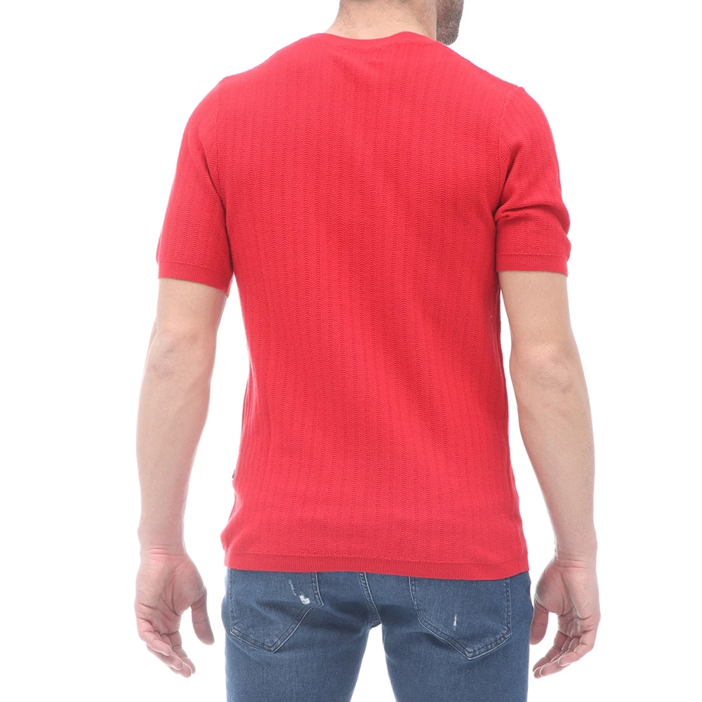 Ανδρική πλεκτή μπλούζα CR7 σε κόκκινη απόχρωση, με ριγέ μοτίβο. Είναι σε slim γραμμή, με κοντά μανίκια και στρογγυλή λαιμόκοψη.