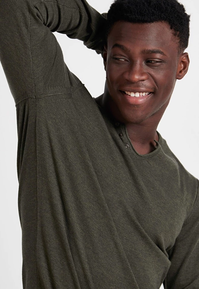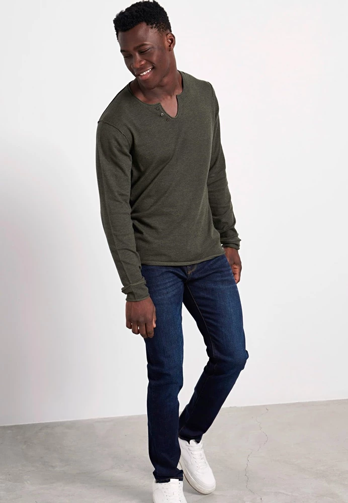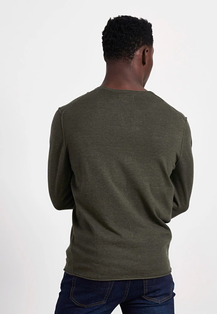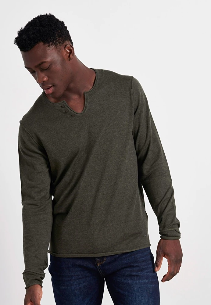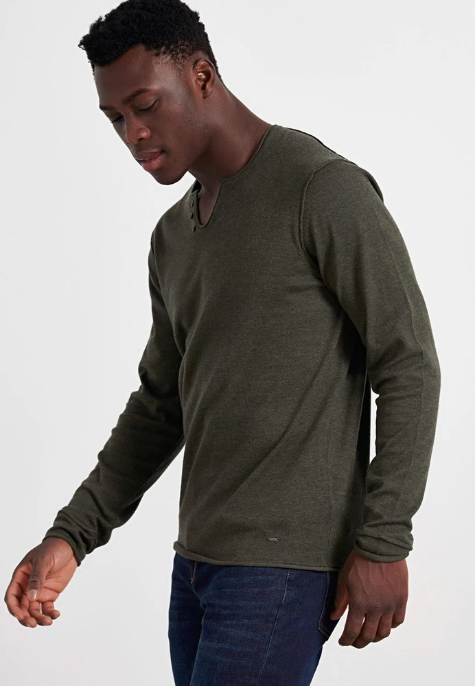 Ανδρική πλεκτή μπλούζα FUNKY BUDDHA σε λαδί χρώμα. Σε ίσια γραμμή, από βαμβακερή σύνθεση. Έχει μακριά μανίκια και V λαιμόκοψη.
