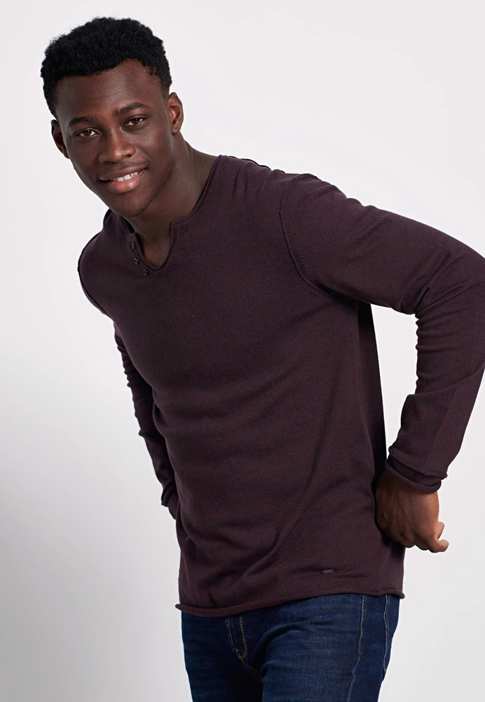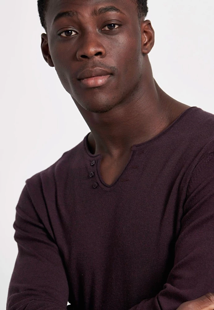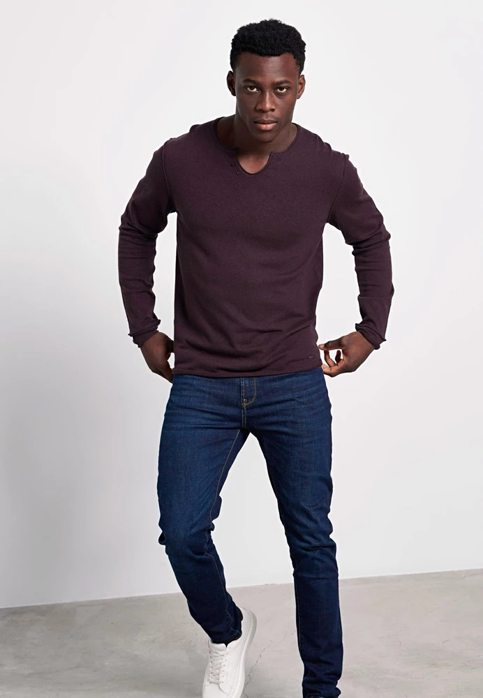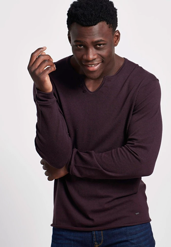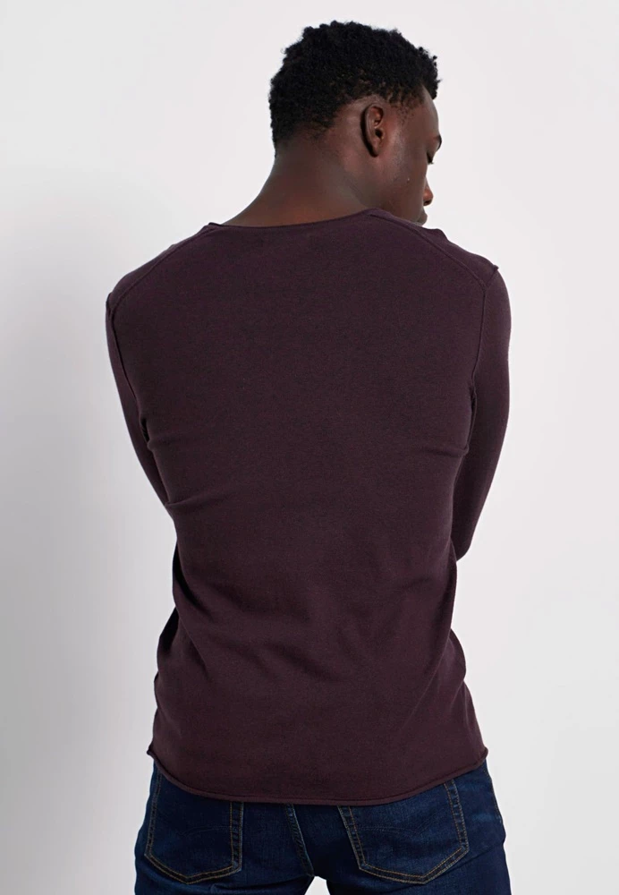 Ανδρική πλεκτή μπλούζα FUNKY BUDDHA σε μωβ χρώμα. Σε ίσια γραμμή, από βαμβακερή σύνθεση. Έχει μακριά μανίκια και V λαιμόκοψη.