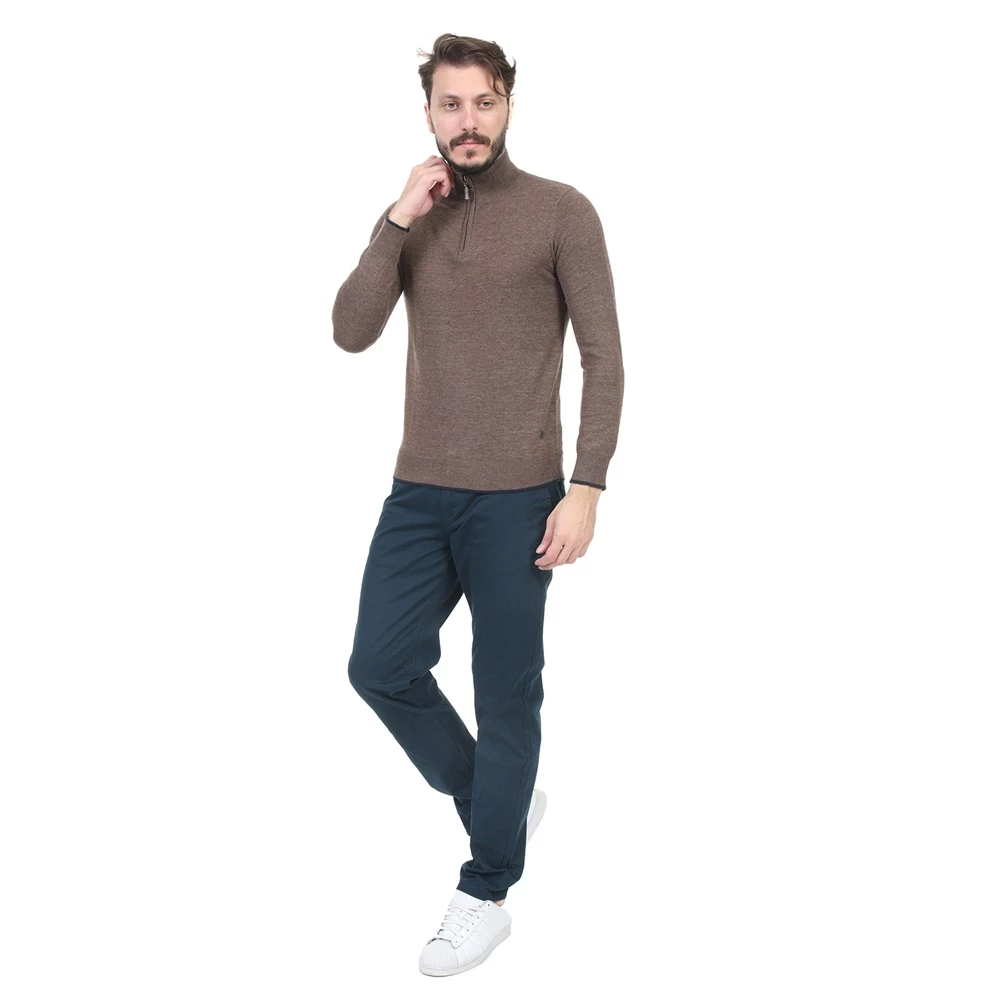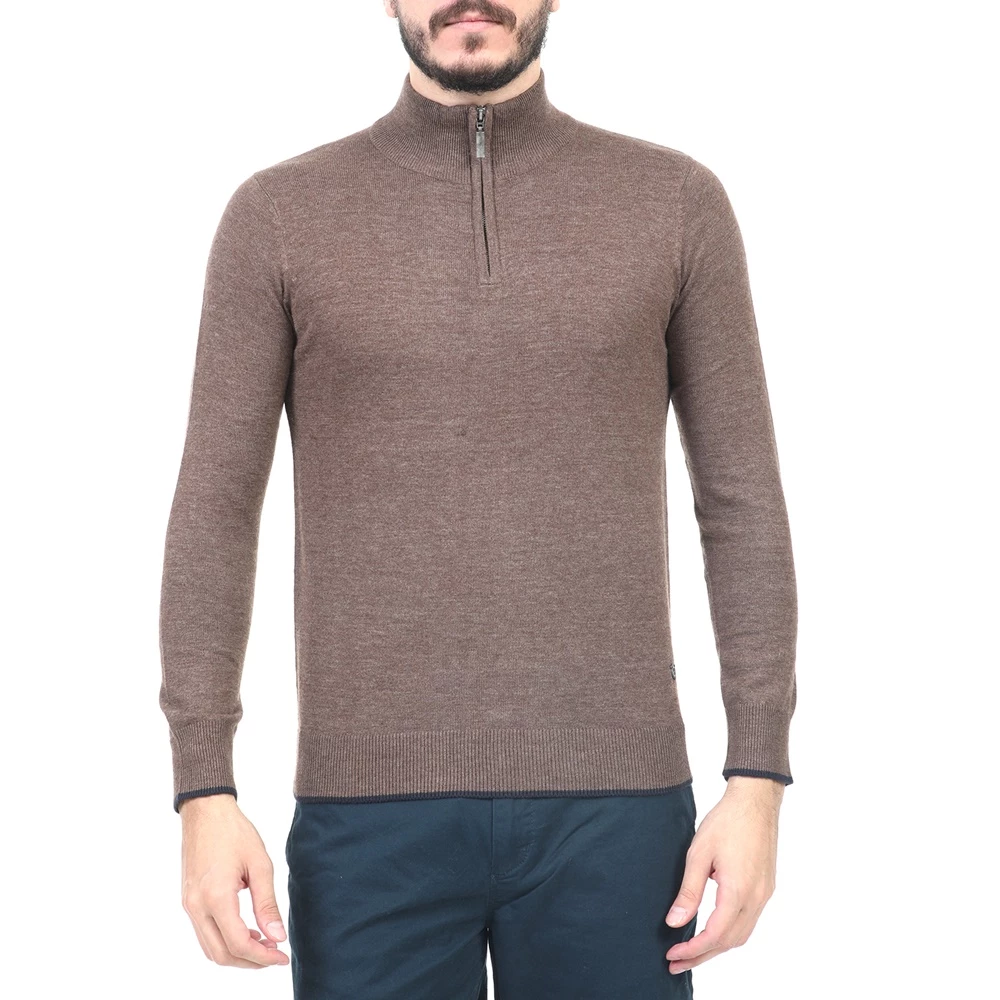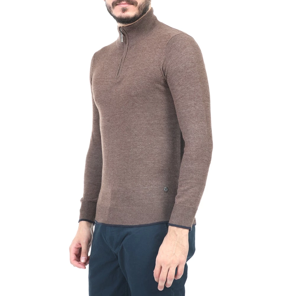 Ανδρική πλεκτή μπλούζα GREENWOOD σε καφέ απόχρωση. Σε ίσια γραμμή, από βαμβακερή σύνθεση. Έχει μακριά μανίκια και όρθιο γιακά με φερμουάρ στην λαιμόκοψη. Λάστιχο ριμπ στη βάση και τις μανσέτες.