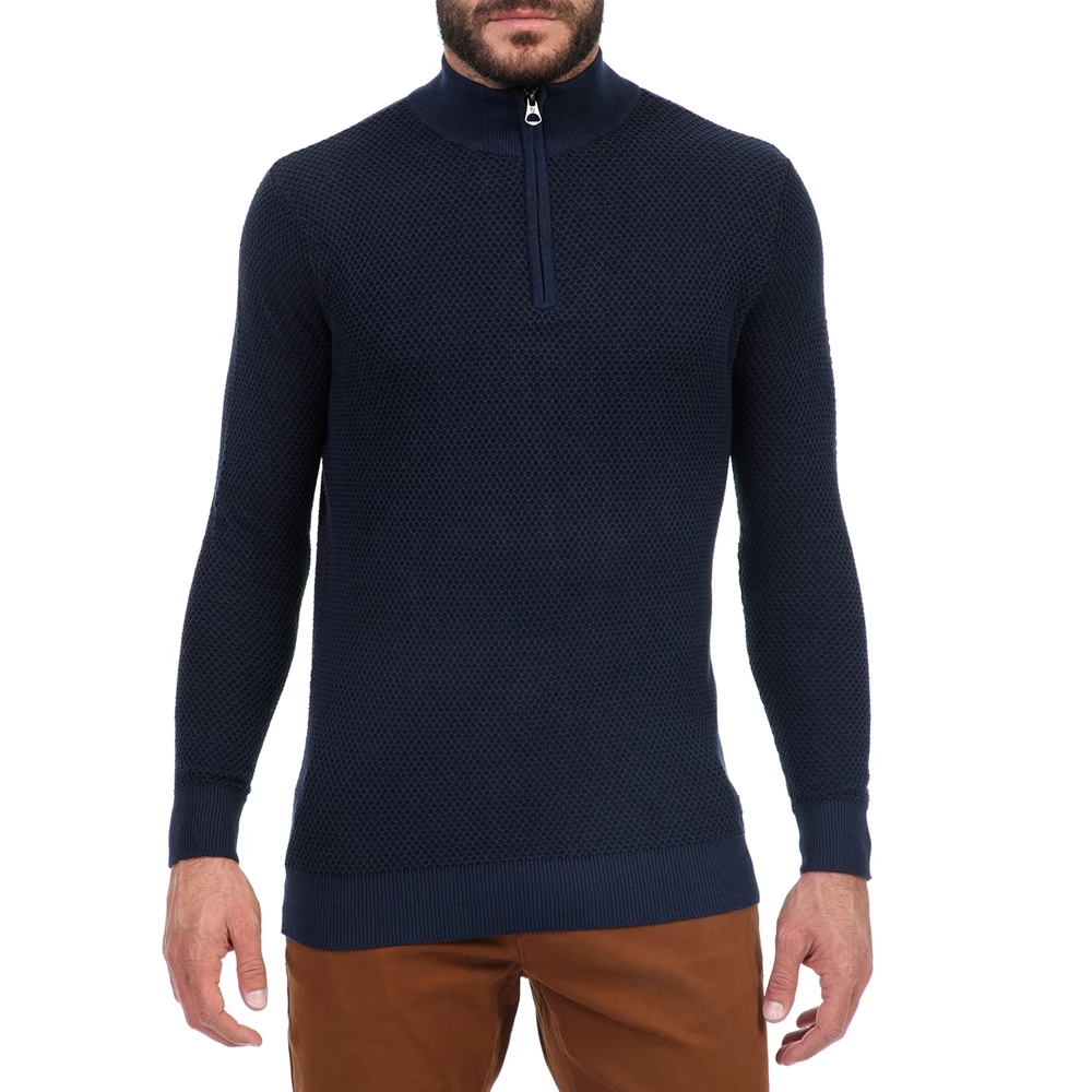 Ανδρική πλεκτή μπλούζα OCEAN SHARK σε μπλε απόχρωση. Σε ίσια γραμμή, από βαμβακερή σύνθεση, με ανάγλυφη πλέξη. Έχει μακριά μανίκια και όρθιο γιακά με φερμουάρ στην λαιμόκοψη. Λάστιχο ριμπ στη βάση και τις μανσέτες.