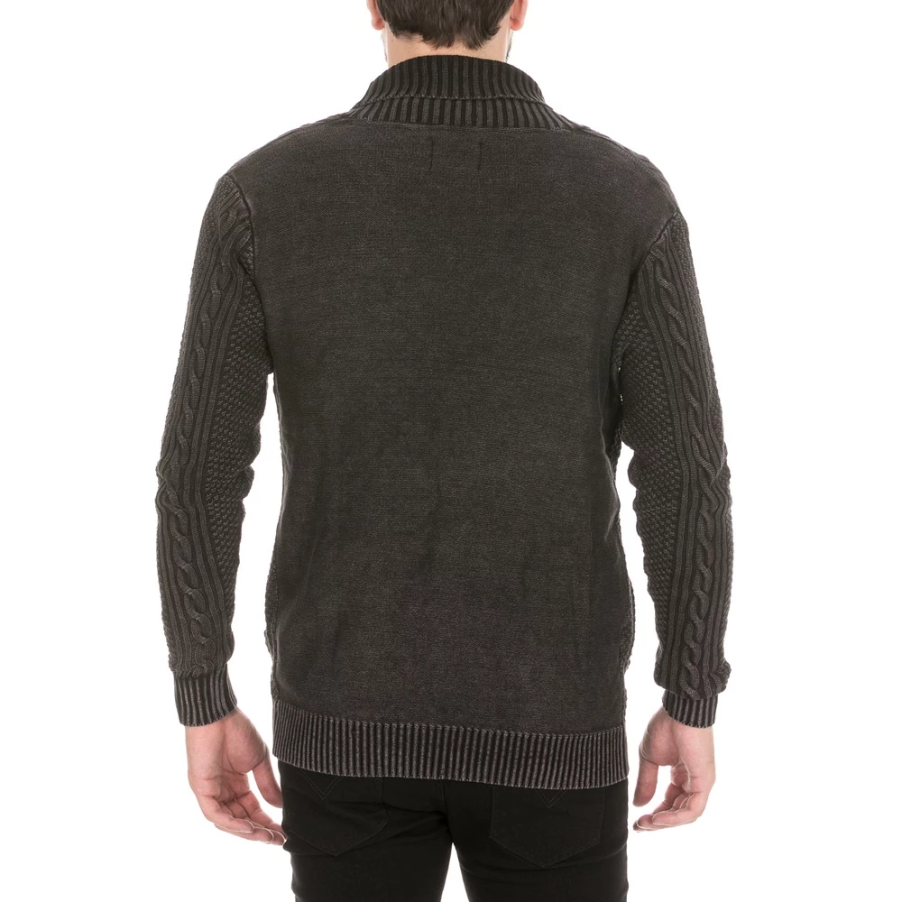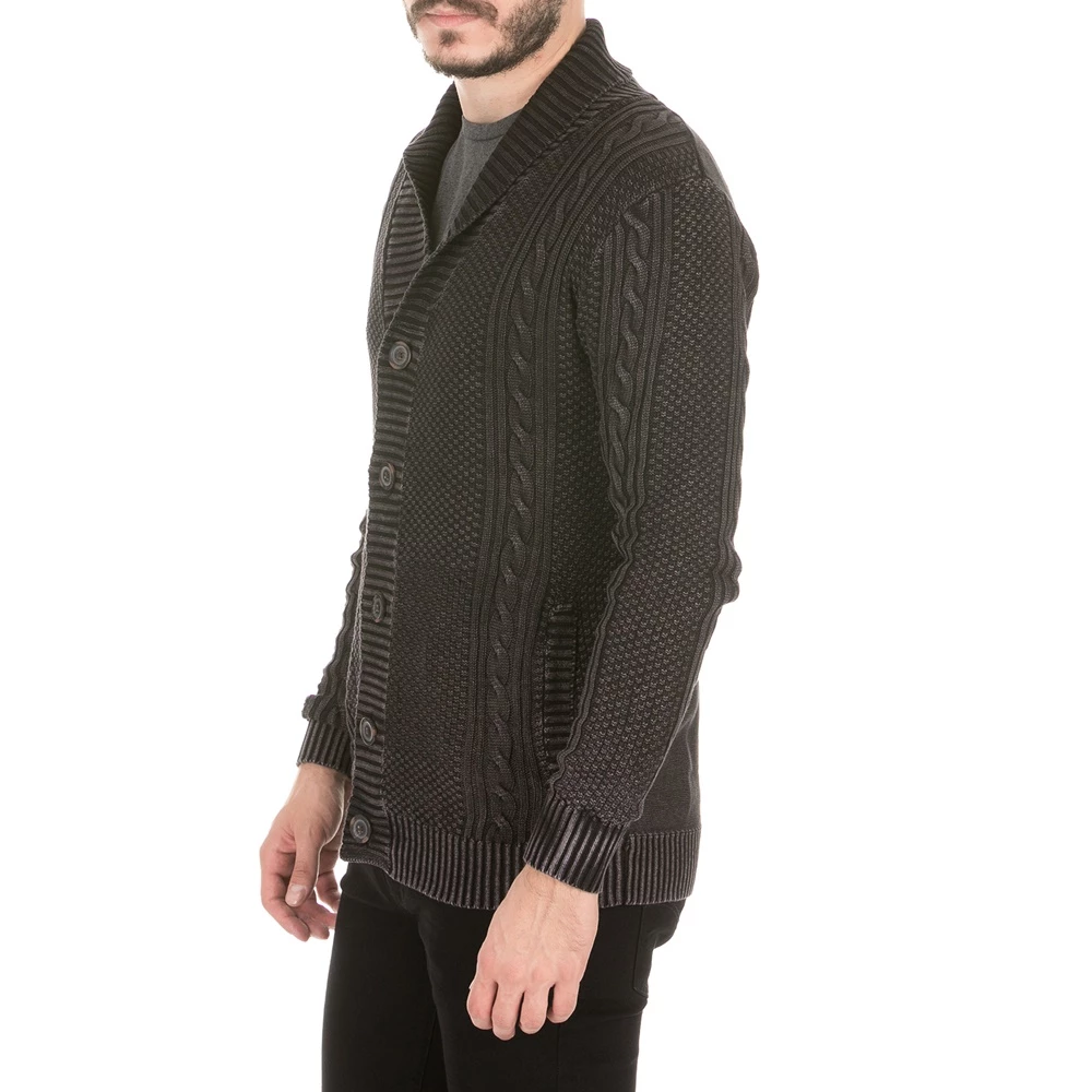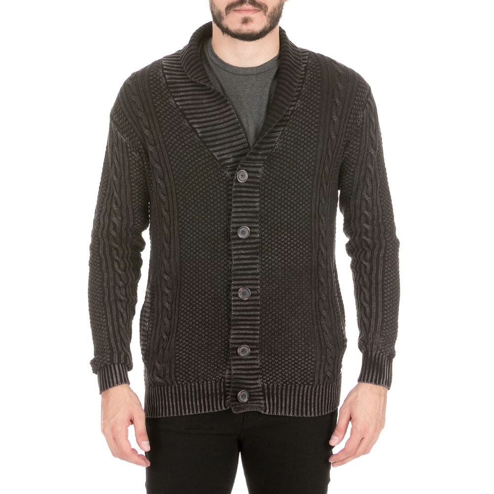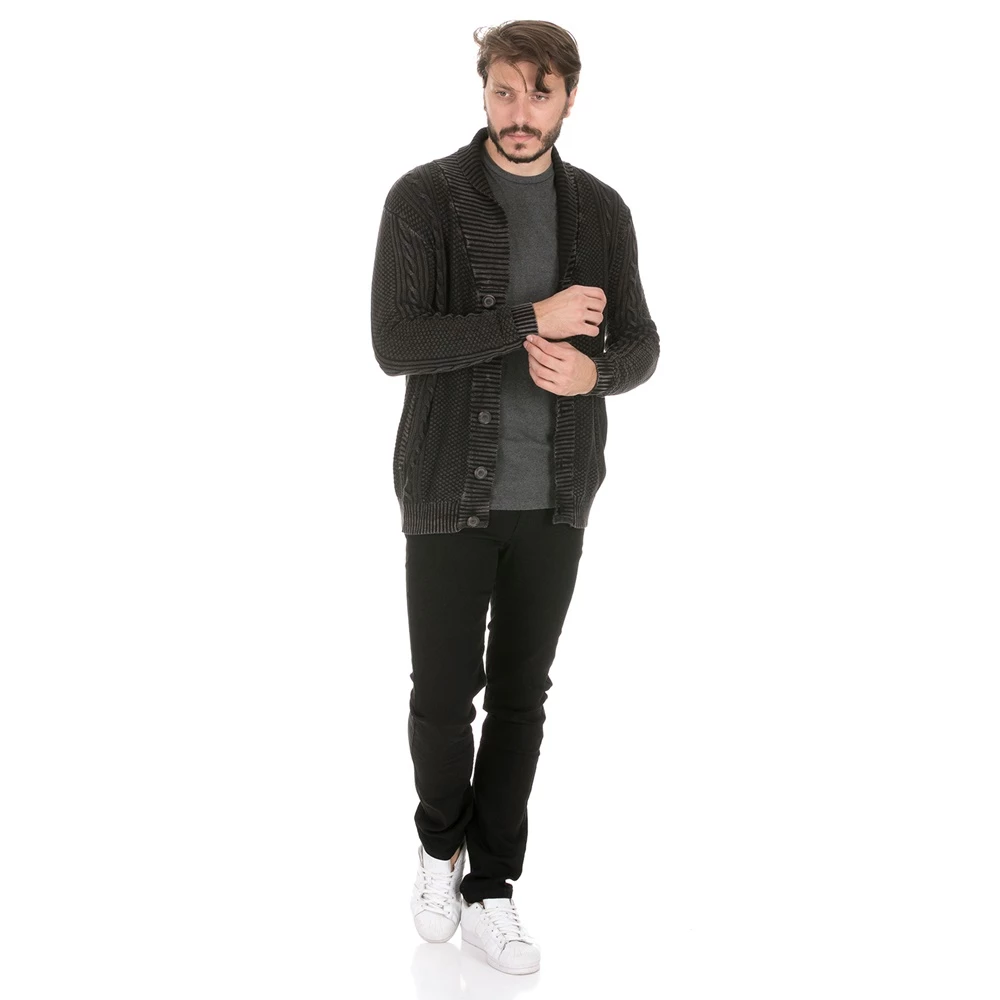 Ανδρική πλεκτή ζακέτα BATTERY σε μαύρο χρώμα. Είναι σε ίσια γραμμή, με ανάγλυφο πλεκτό μοτίβο. Έχει γυριστό γιακά με V λαιμόκοψη και μακριά μανίκια. Δύο τσέπες στα πλάγια και ριμπ πλέξη στα τελειώματα. Κλείνει με κουμπιά μπροστά.