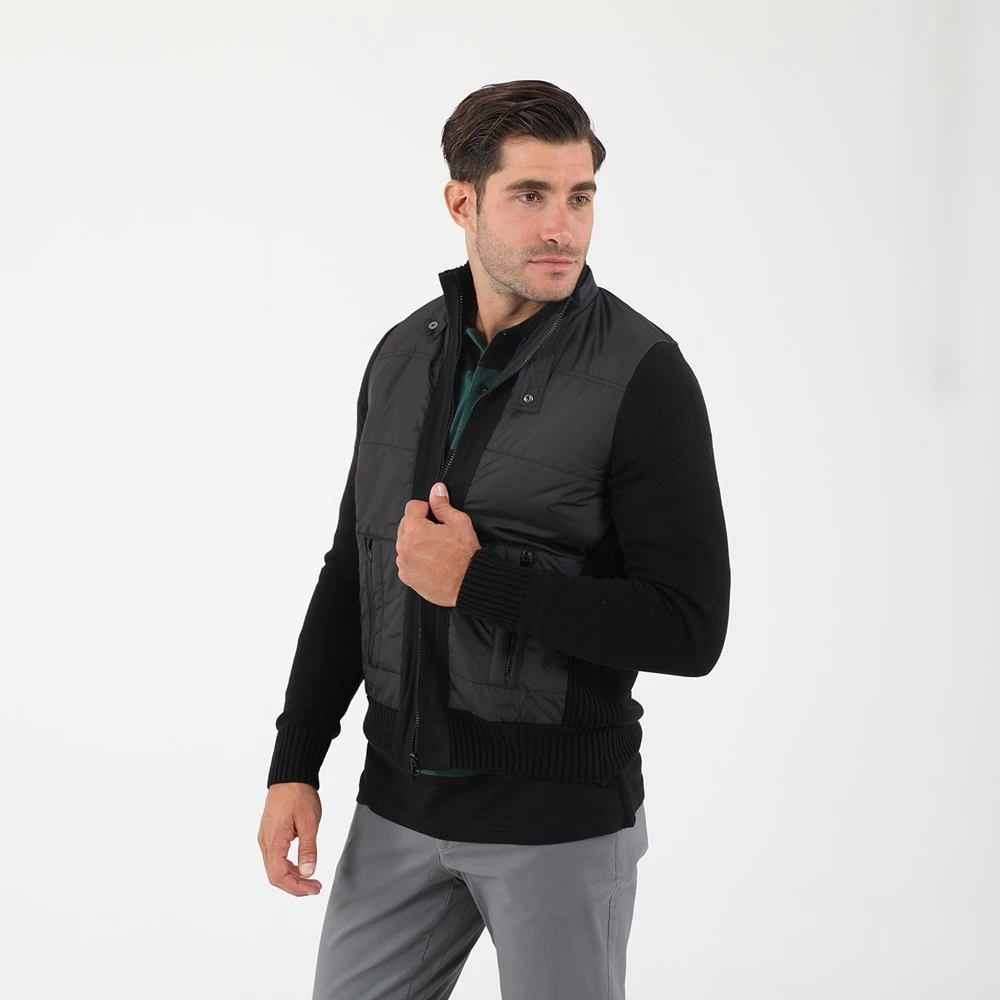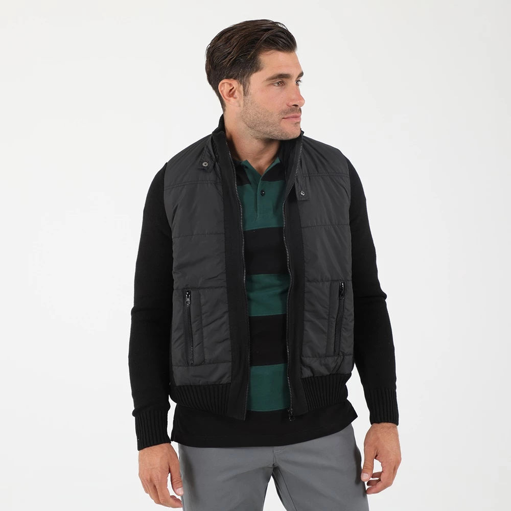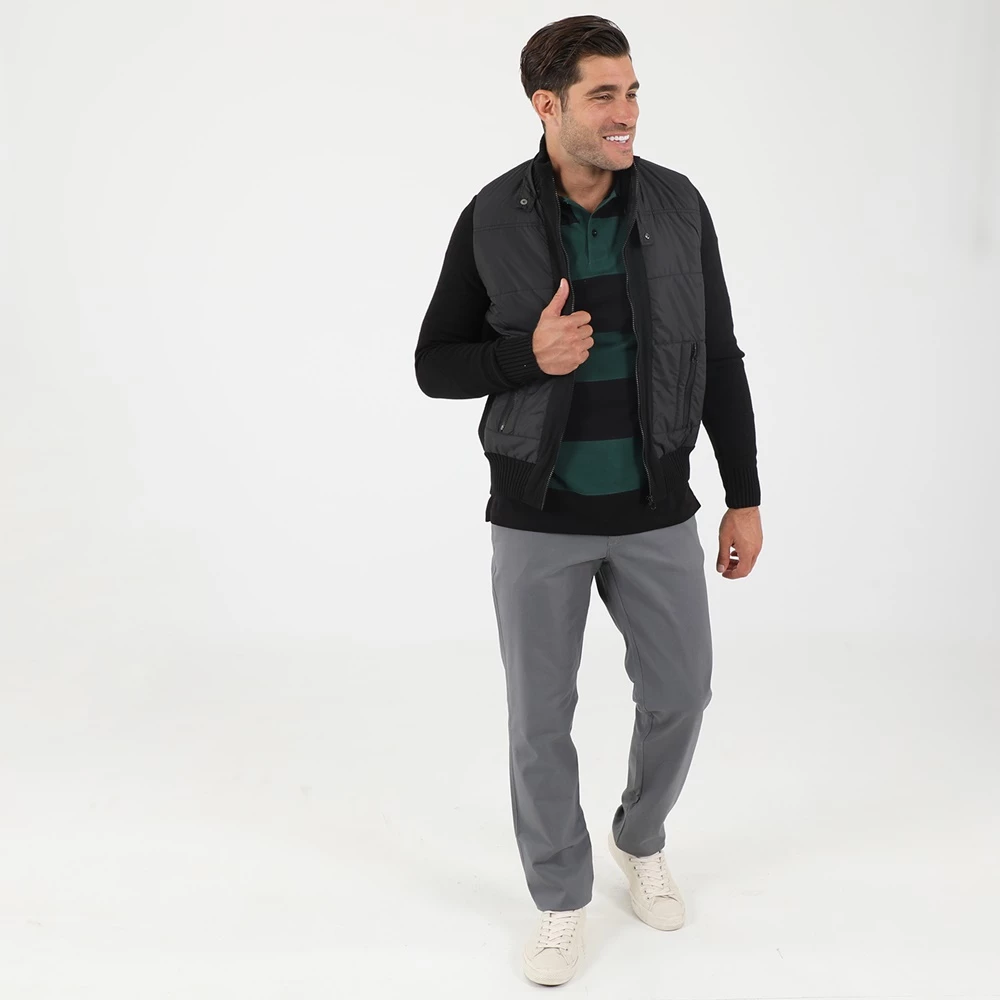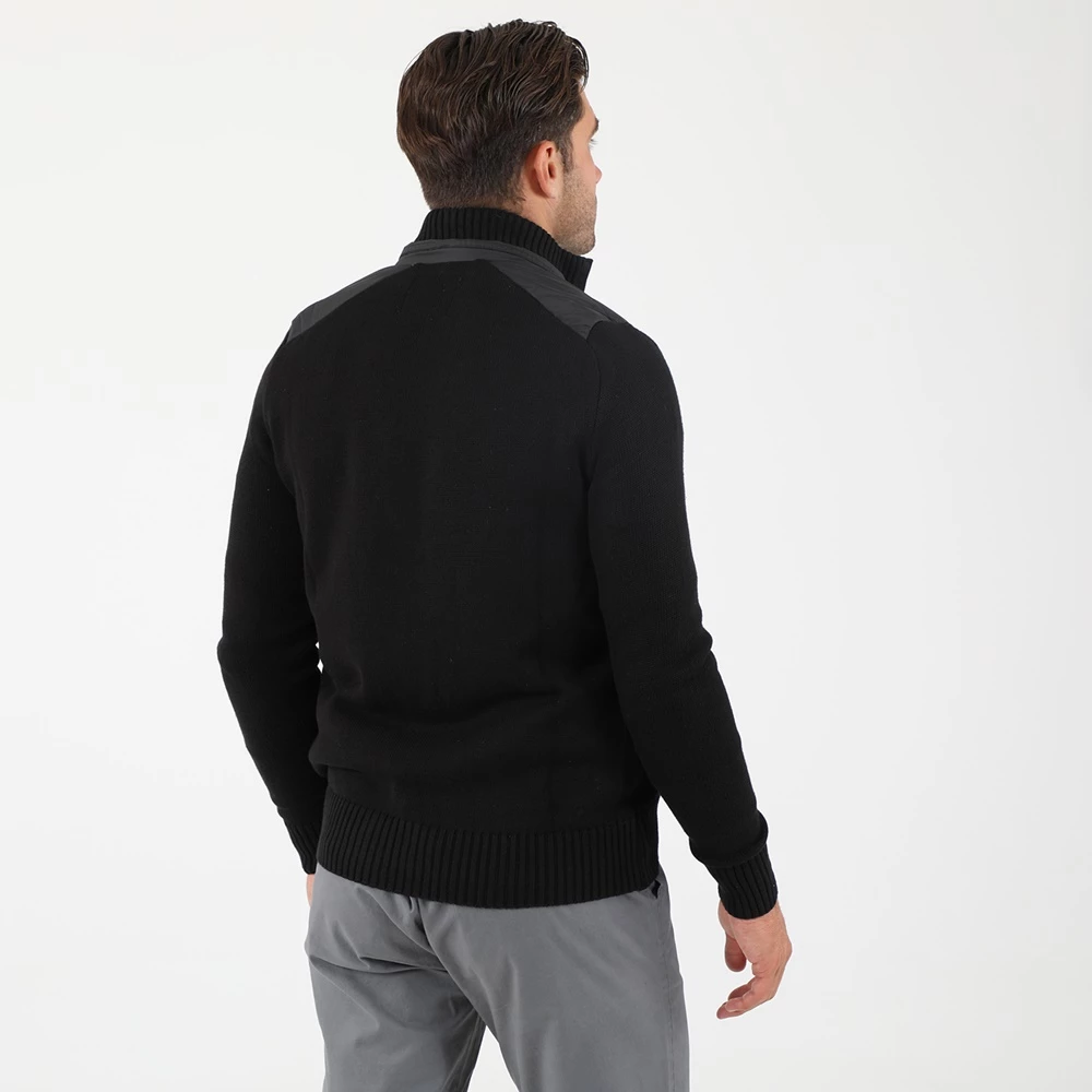 Ανδρική πλεκτή ζακέτα DORS σε μαύρο και γκρι χρώμα. Έχει κανονική εφαρμογή, μακριά μανίκια και όρθια λαιμόκοψη. Διαθέτει δύο τσέπες στα πλαϊνά, λάστιχο rib στα τελειώματα και κλείνει με φερμουάρ μπροστά.