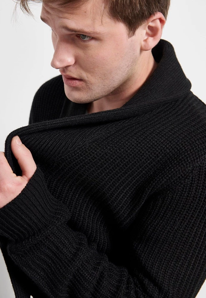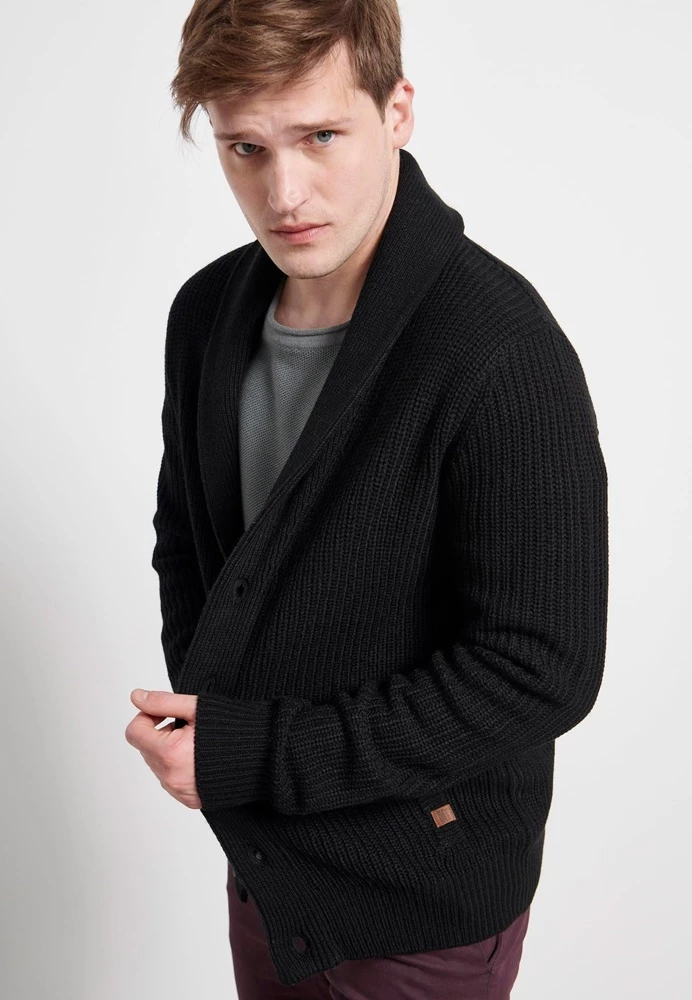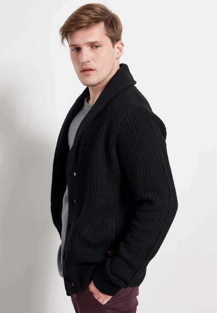 Ανδρική πλεκτή ζακέτα FUNKY BUDDHA σε μαύρο χρώμα, με ριγωτή πλέξη. Από ζεστή μάλλινη σύνθεση, με χαμηλή V λαιμόκοψη και πλαϊνές τσέπες.