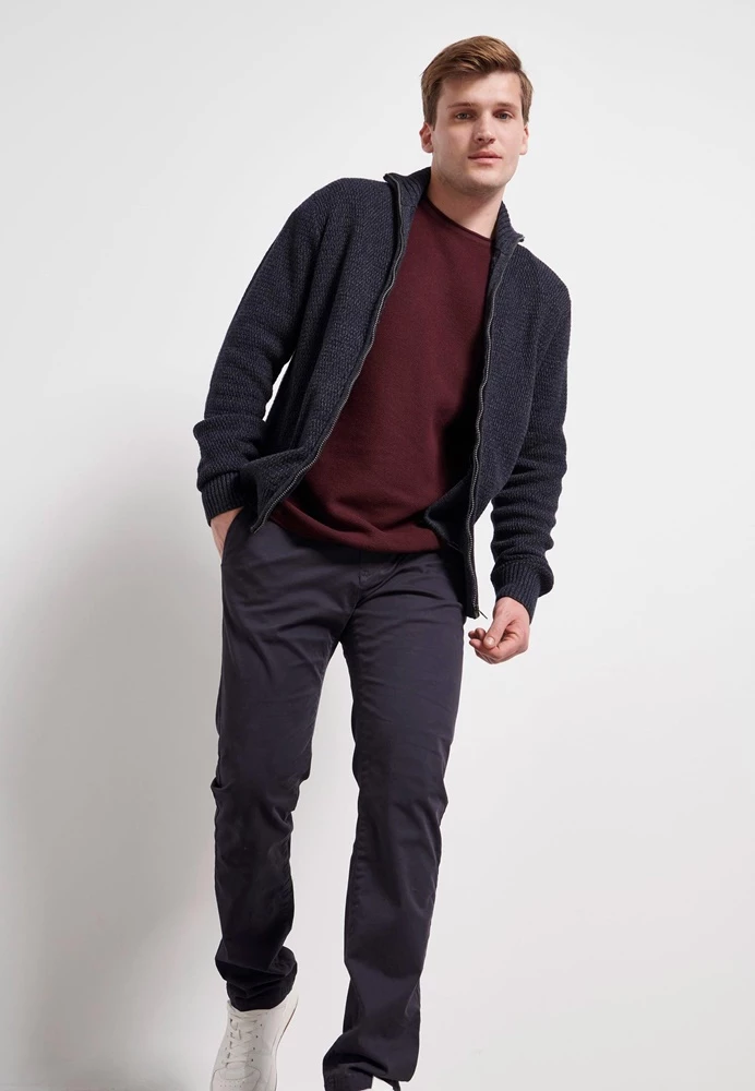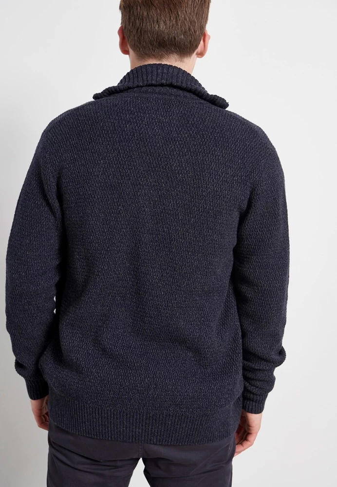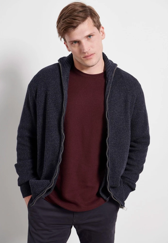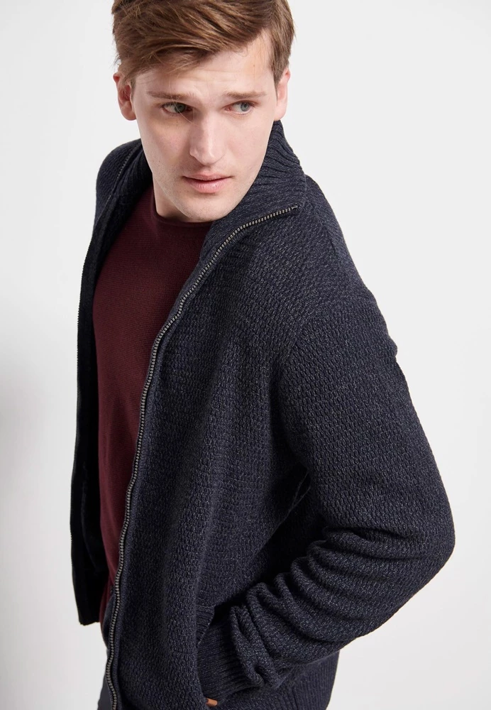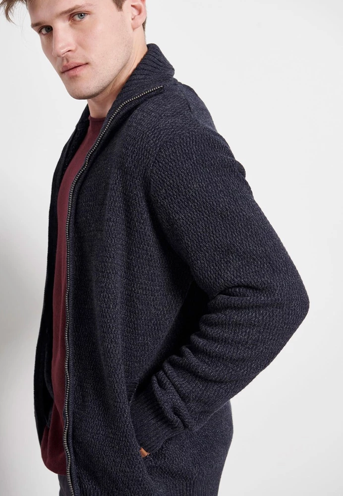 Ανδρική πλεκτή ζακέτα FUNKY BUDDHA σε μπλε απόχρωση. ‘Εχει λεπτή πλέξη και rib τελειώματα. Funky Buddha λογότυπο πάνω από το τελείωμα κλείνει με φερμουάρ μπροστά.