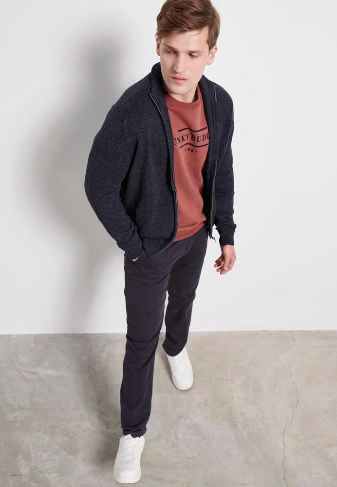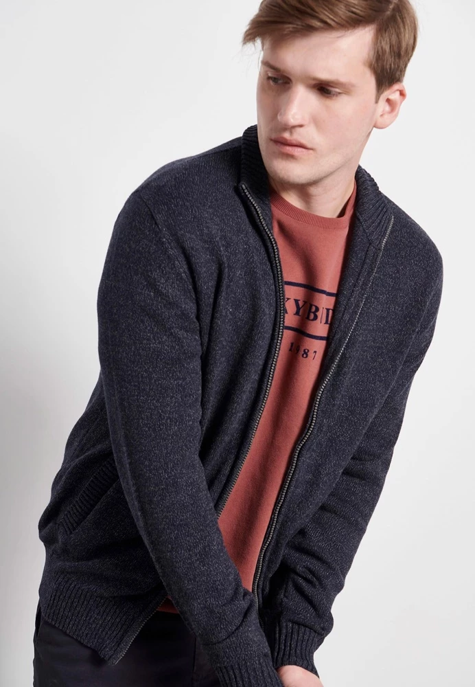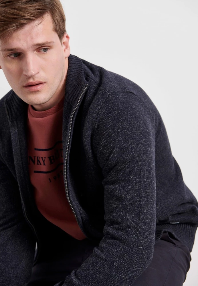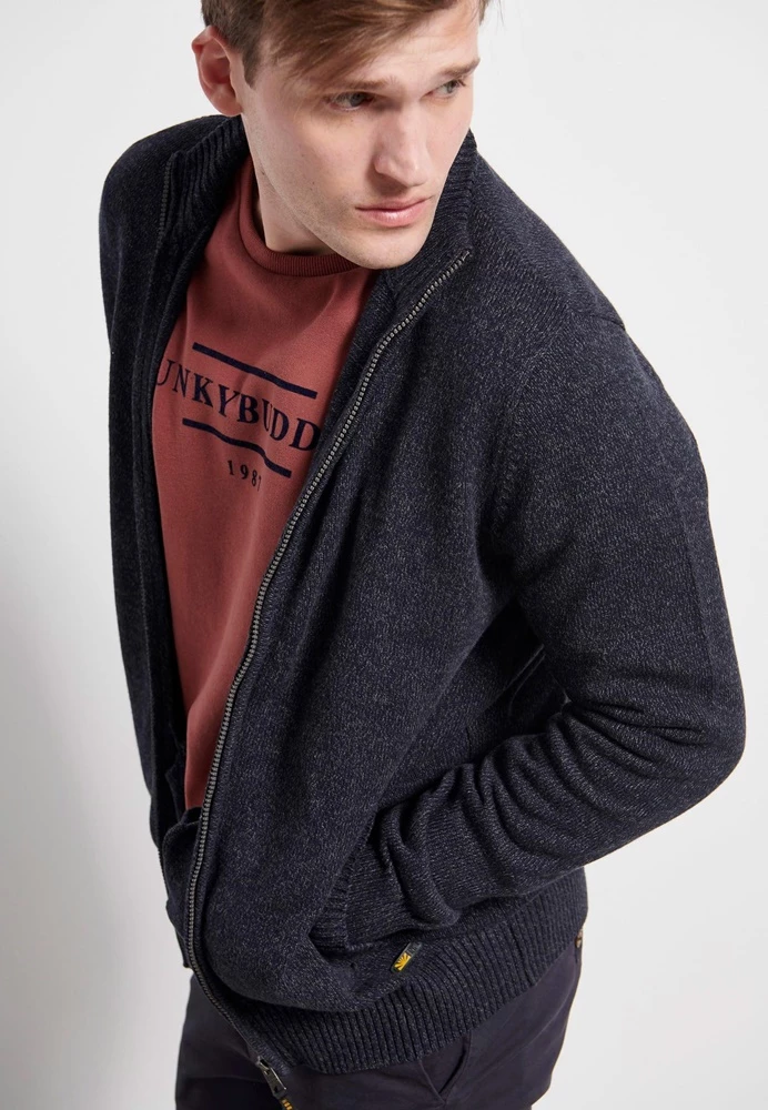 Ανδρική πλεκτή ζακέτα FUNKY BUDDHA σε μπλε απόχρωση. ‘Εχει λεπτή πλέξη και rib τελειώματα. Funky Buddha λογότυπο πάνω από το τελείωμα κλείνει με φερμουάρ μπροστά.