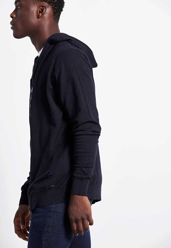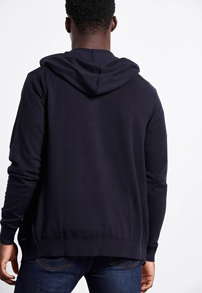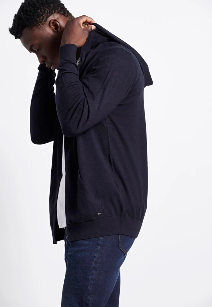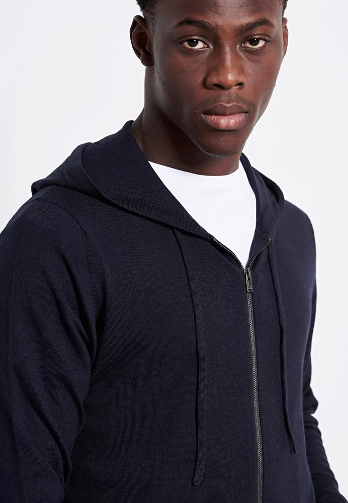Ανδρική πλεκτή ζακέτα FUNKY BUDDHA σε μπλε απόχρωση. Από βαμβακερή σύνθεση, με λεπτή πλέξη και rib τελειώματα. Διαθέτει κουκούλα με κορδόνι, δύο τσέπες στα πλαϊνά και κλείνει με φερμουάρ μπροστά.
