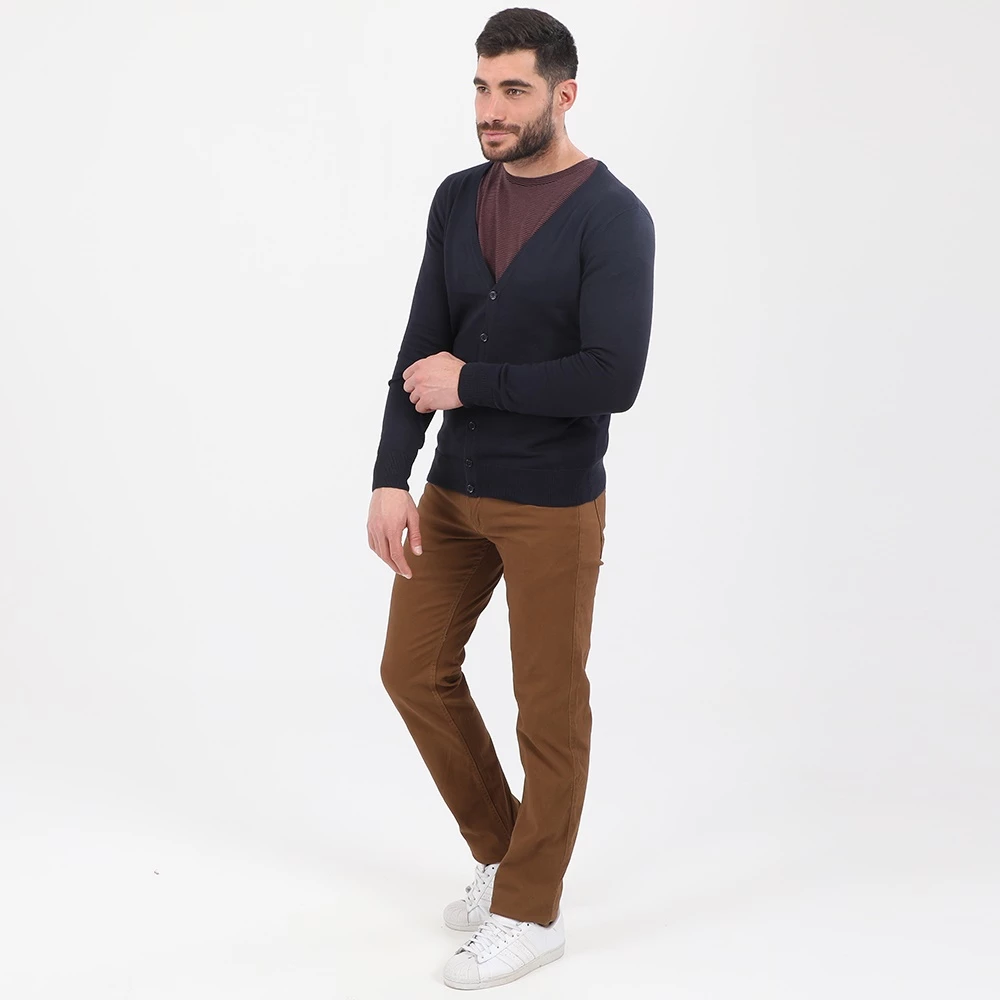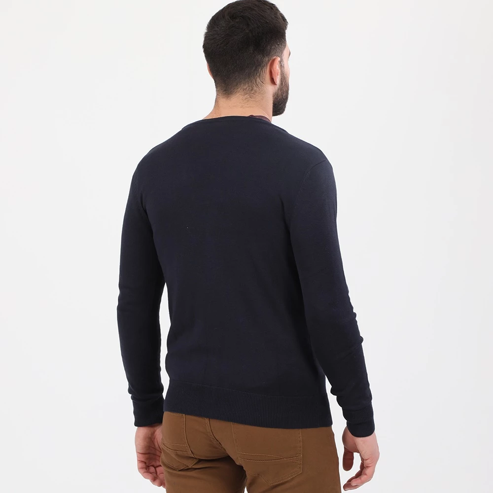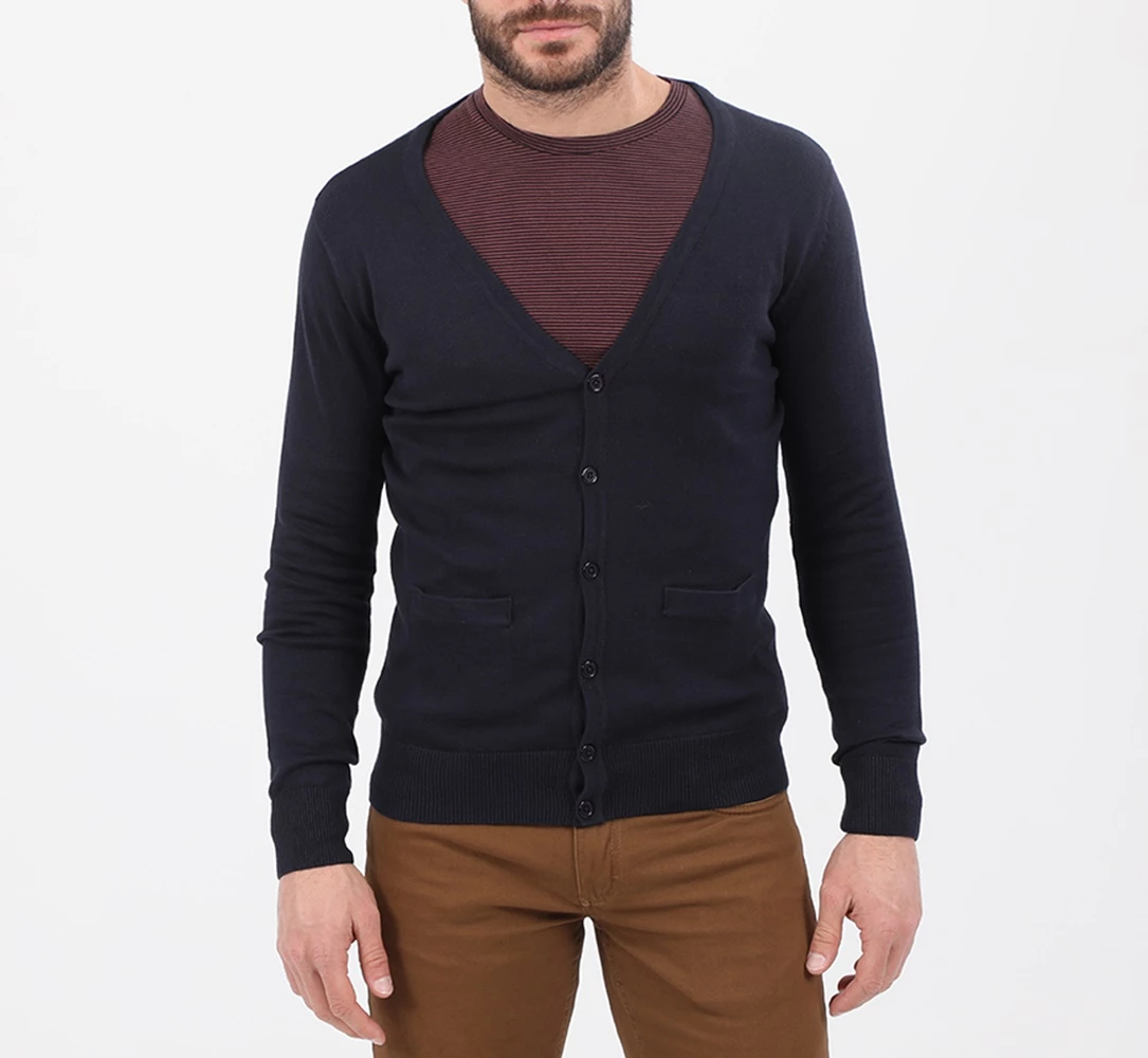 Ανδρική πλεκτή ζακέτα RUN σε ναυτική μπλε απόχρωση. Από λεπτή πλέξη, με μακριά μανίκια και V λαιμόκοψη. Διαθέτει δύο τσέπες μπροστά και κλείνει με κουμπιά μπροστά.