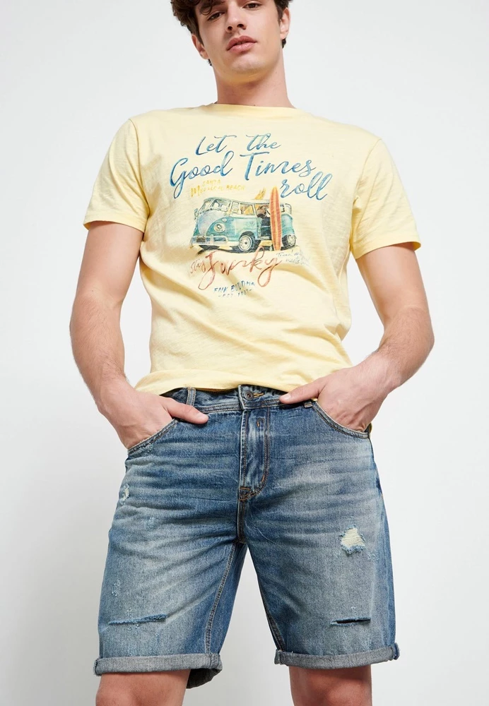 Ανδρική τζιν βερμούδα FUNKY BUDDHA σε μπλε απόχρωση. Από σταθερό βαμβακερό ύφασμα, με κανονική εφαρμογή. Διαθέτει τσέπες μπροστά, πίσω και στα πλαϊνά. Κλείνει με κουμπί και φερμουάρ.