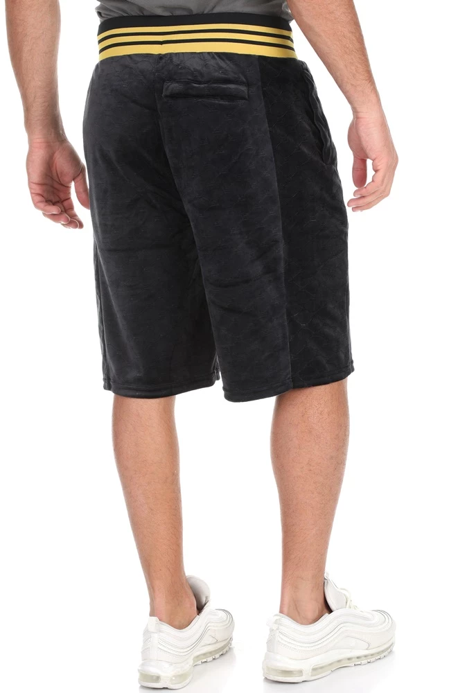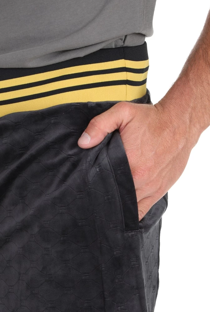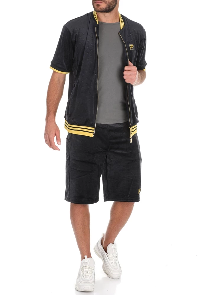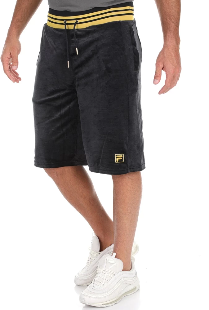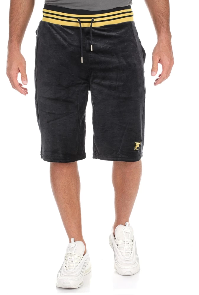 Ανδρική βερμούδα FILA EMERY σε μαύρο χρώμα, με κίτρινες λεπτομέρειες. Με βελουτέ υφή και ανάγλυφο επαναλλαμβανόμενο μοτίβο με το λογότυπο σε όλη την επιφάνεια. Διαθέτει λάστιχο με κορδόνι στη μέση, δύο τσέπες στα πλάγια και μία τσέπη πίσω.