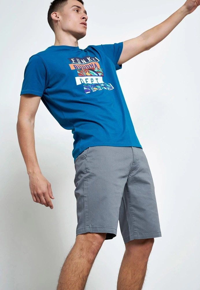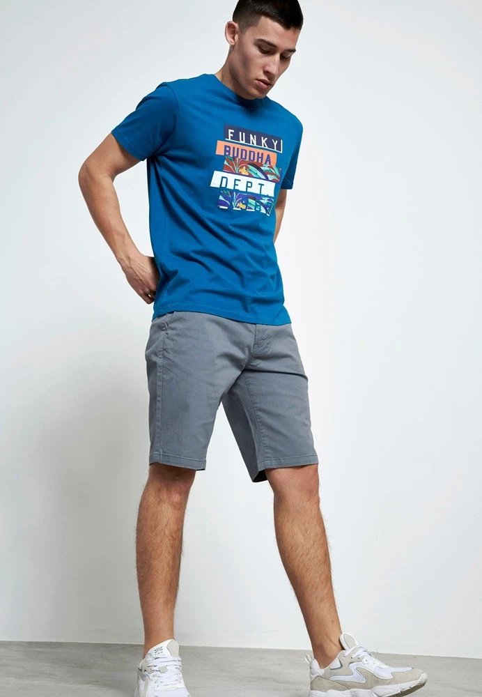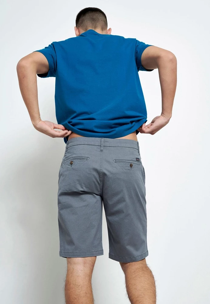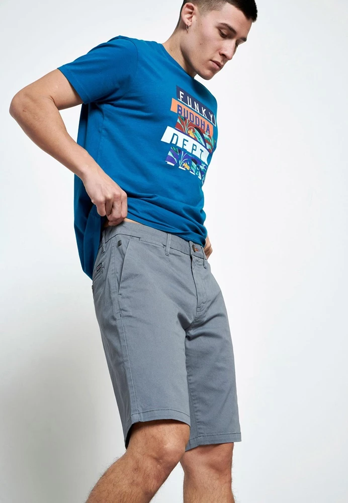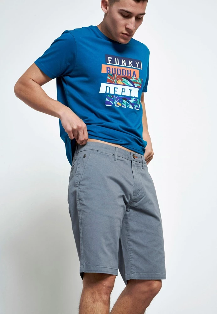 Ανδρική βερμούδα FUNKY BUDDHA σε γκρι απόχρωση. Σε στιλ chino, με κανονική εφαρμογή. Διαθέτει δύο μπροστινές και δύο πίσω τσέπες. Κλείνει με κουμπί και φερμουάρ μπροστά.