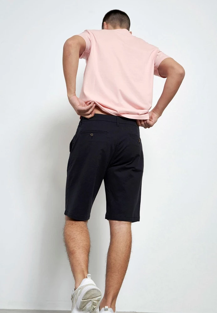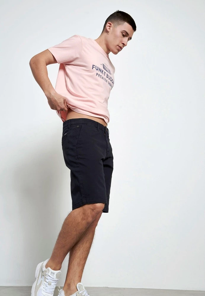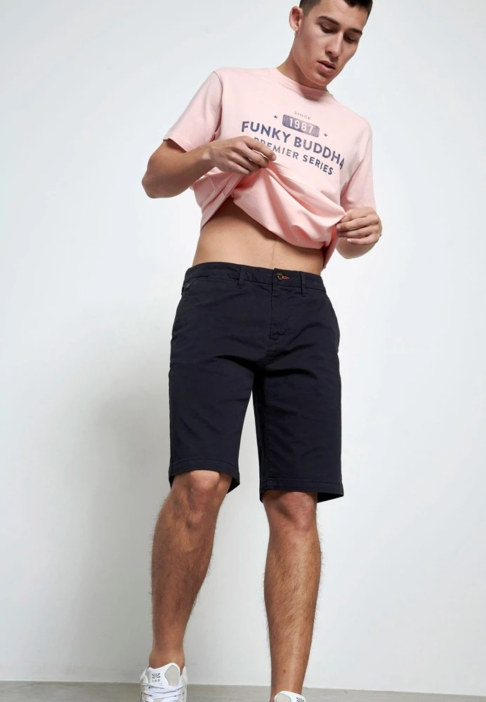 Ανδρική βερμούδα FUNKY BUDDHA σε μαύρο χρώμα. Σε στιλ chino, με κανονική εφαρμογή. Διαθέτει δύο μπροστινές και δύο πίσω τσέπες. Κλείνει με κουμπί και φερμουάρ μπροστά.