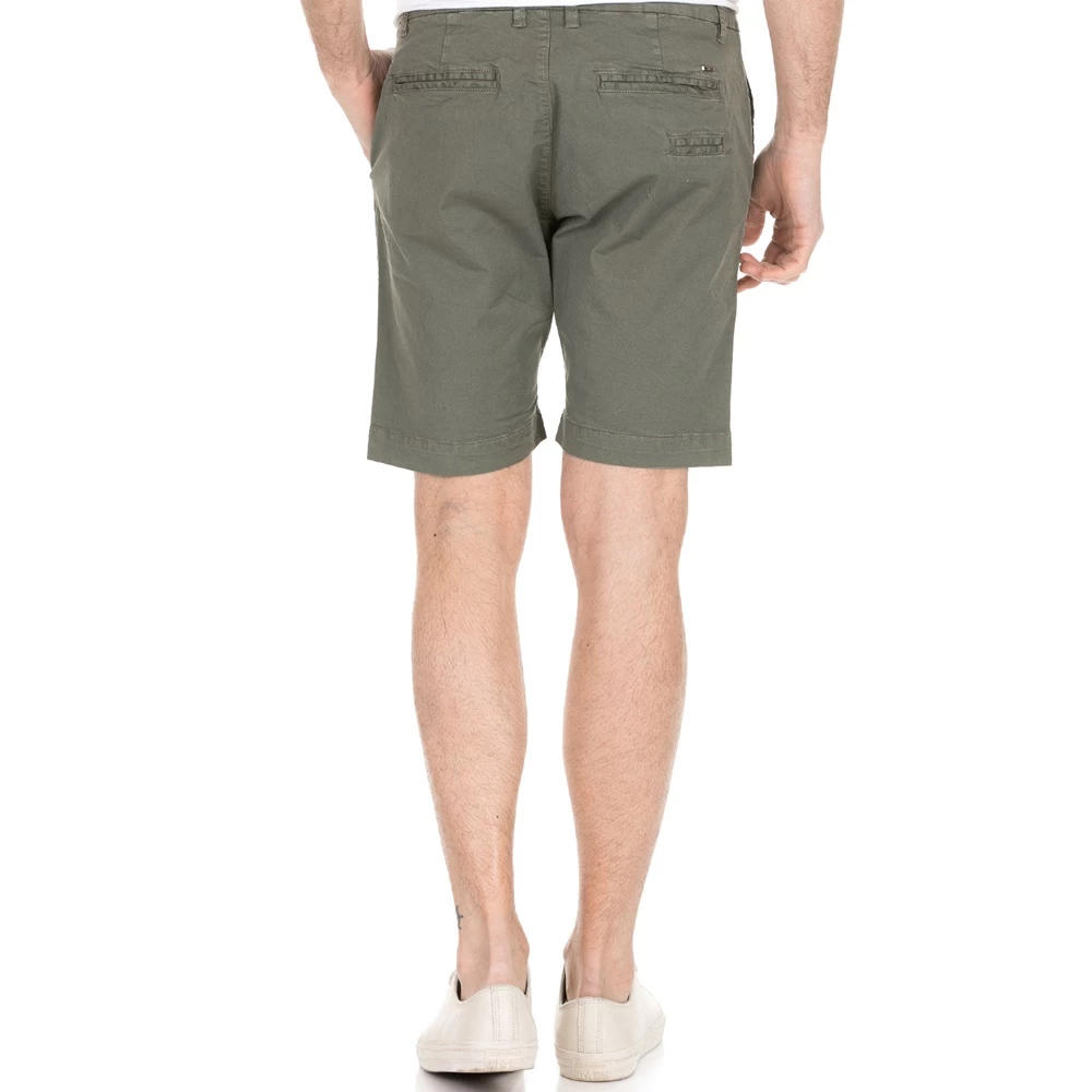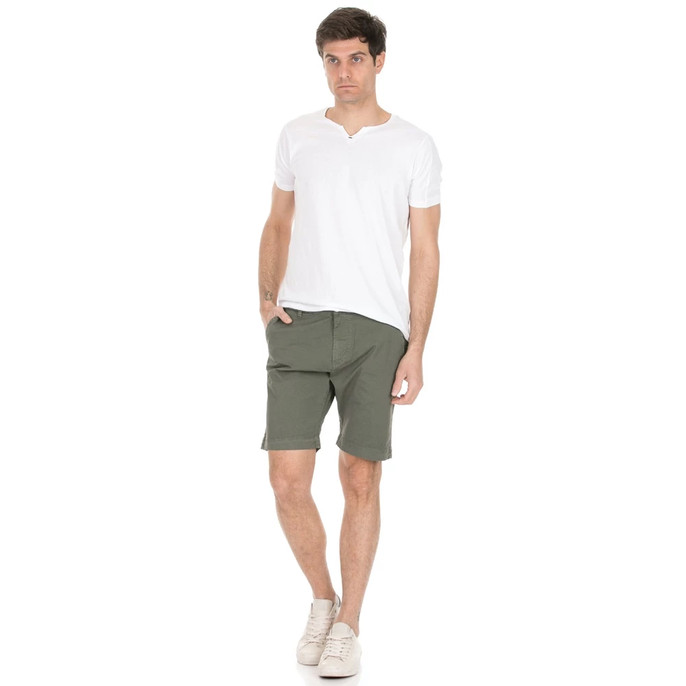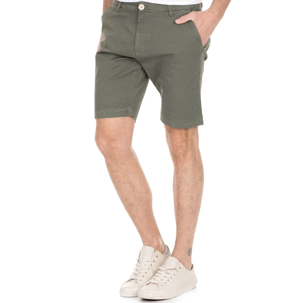 Ανδρική βερμούδα σε χακί απόχρωση με τσέπες μπροστά και πίσω και ίσια γραμμή. Κλείνει με κουμπί και φερμουάρ.