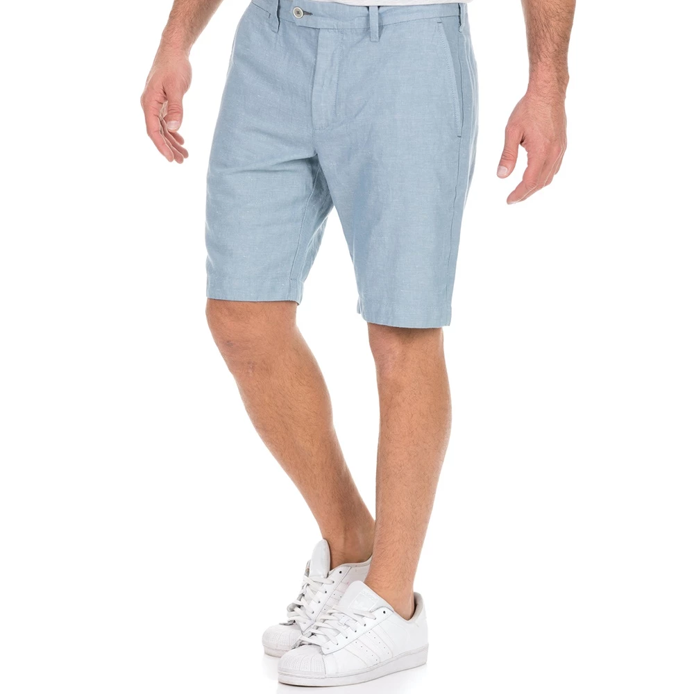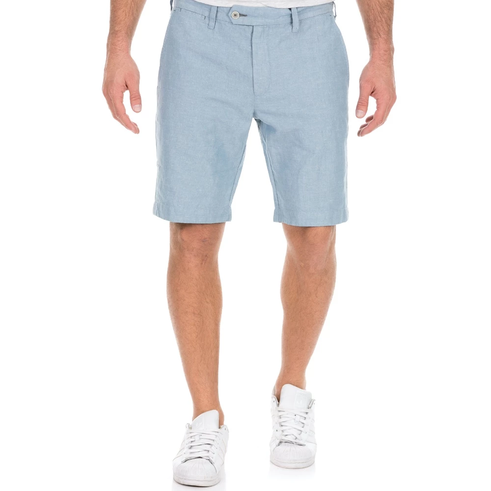 Ανδρική βερμούδα TED BAKER σε γαλάζια απόχρωση. Σε ίσια γραμμή, από λινή σύνθεση για δροσερή αίσθηση. Διαθέτει δύο τσέπες στα πλάγια και δύο τσέπες με κουμπί πίσω. Θηλάκια για ζώνη στη μέση και ασύμμετρο κούμπωμα μπροστά.