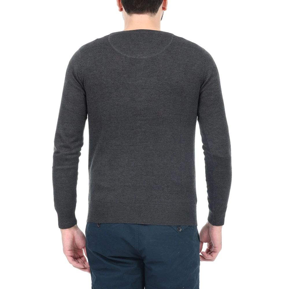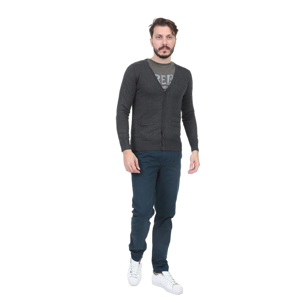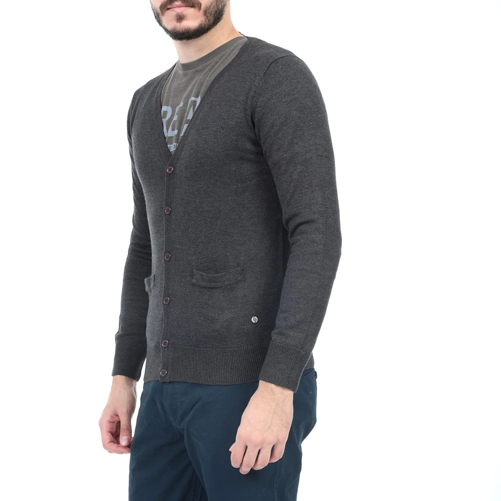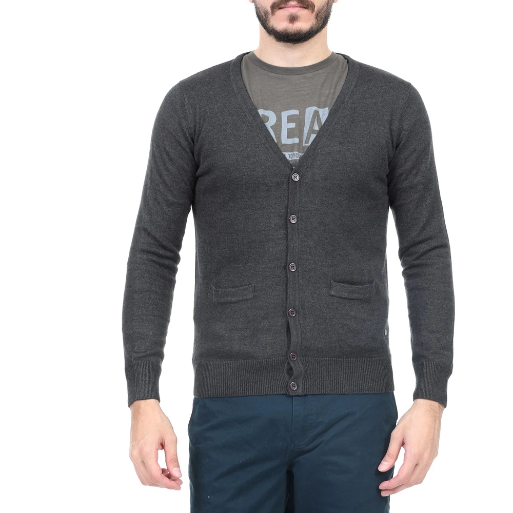 Ανδρική ζακέτα BATTERY σε ανθρακί απόχρωση. Σε ίσια γραμμή, από βαμβακερή πλέξη. Έχει μακριά μανίκια και V λαιμόκοψη. Δύο τσέπες μπροστά και λάστιχο ριμπ στη βάση και τις μανσέτες. Κλείνει με κουμπιά.