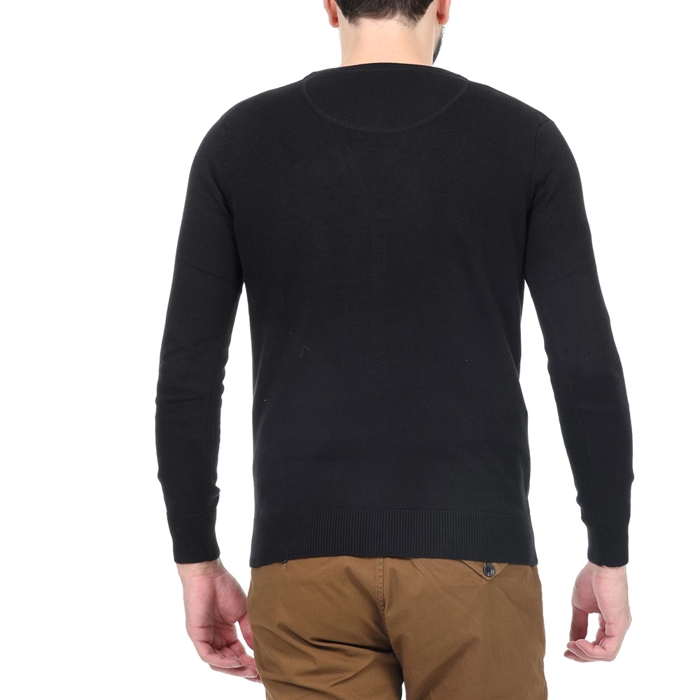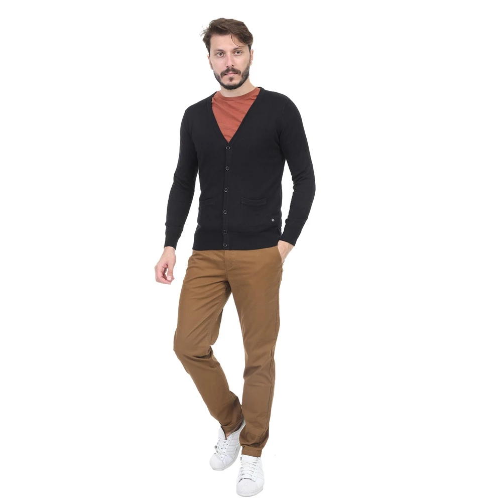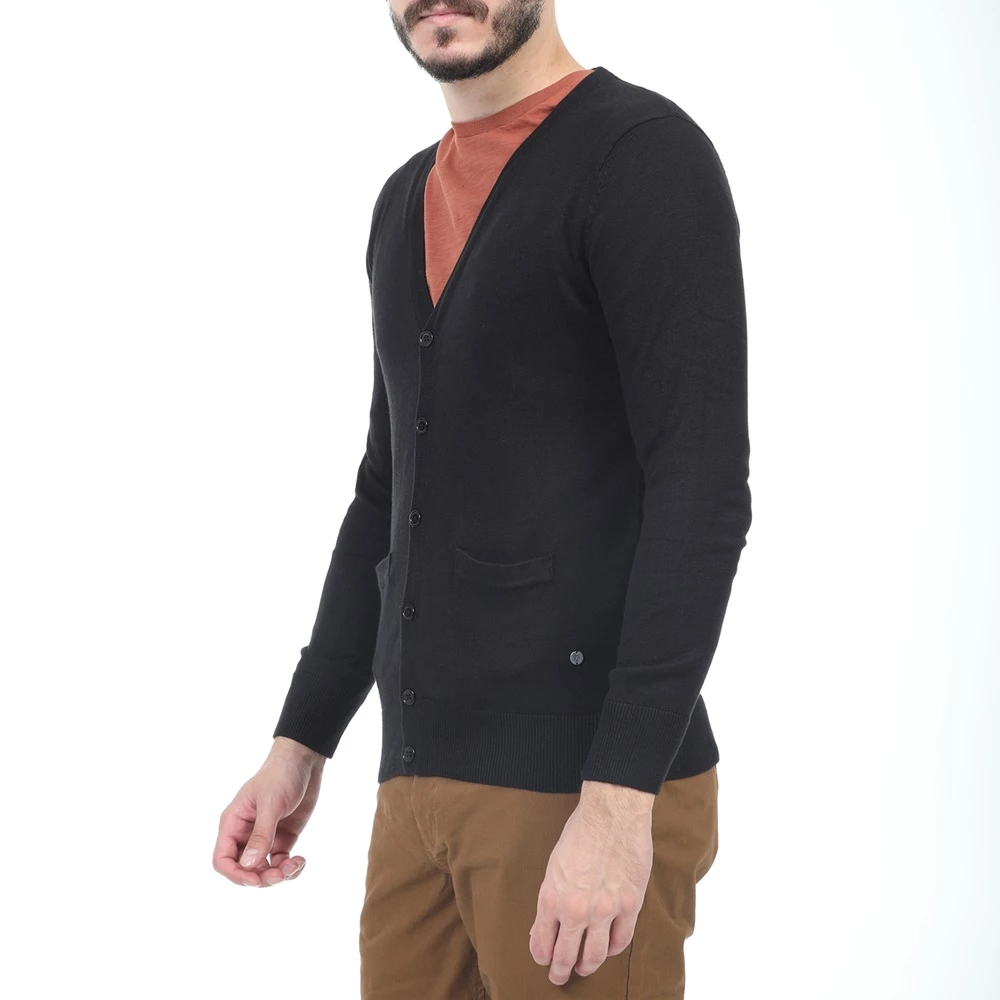 Ανδρική ζακέτα BATTERY σε μαύρο χρώμα. Σε ίσια γραμμή, από βαμβακερή πλέξη. Έχει μακριά μανίκια και V λαιμόκοψη. Δύο τσέπες μπροστά και λάστιχο ριμπ στη βάση και τις μανσέτες. Κλείνει με κουμπιά.