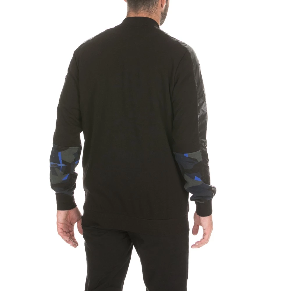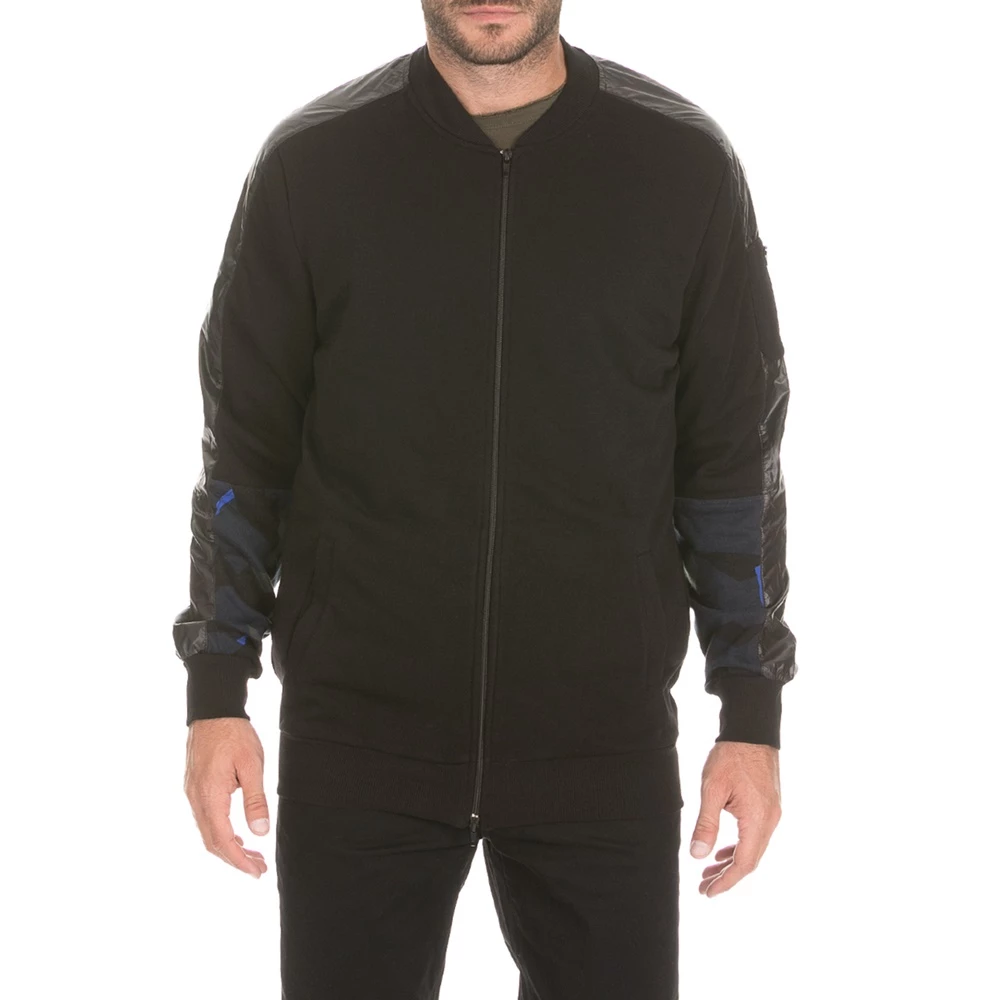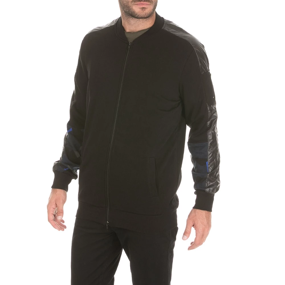 Ανδρική φούτερ ζακέτα BODYTALK σε μαύρο χρώμα με μοτίβο παραλλαγής χαμηλά στα μανίκια. Σε στυλ bomber με μακριά μανίκια και στρογγυλή λαιμόκοψη. Διαθέτει μία τσέπη με φερμουάρ στο μπράτσο και δύο τσέπες στα πλάγια. Ριμπ πλέξη στην βάση, την λαιμόκοψη και τις μανσέτες. Κλείνει με φερμουάρ μπροστά.