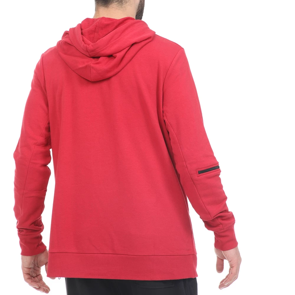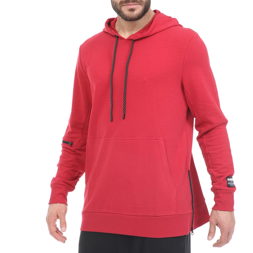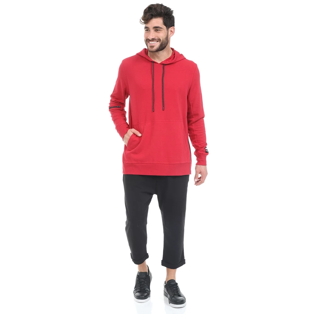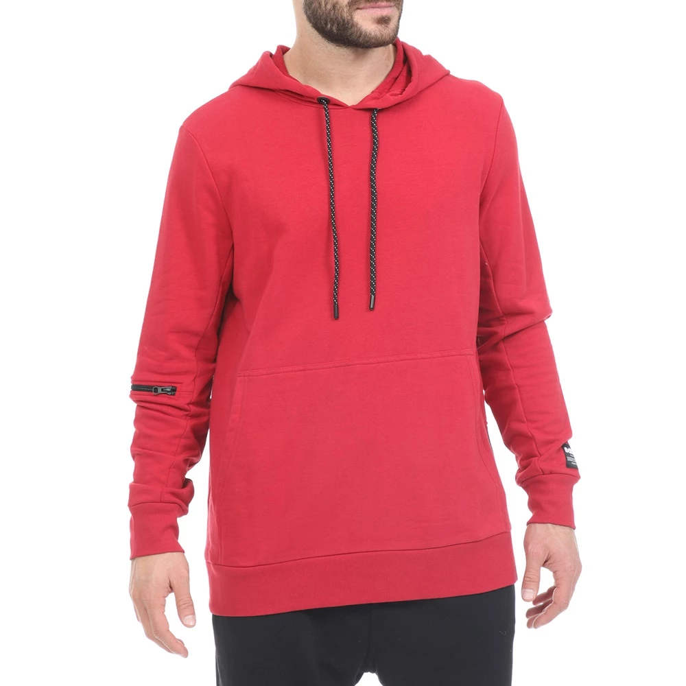 Ανδρικό φούτερ σε μπορντό απόχρωση και loose γραμμή. Έχει τσέπη καγκουρό μπροστά, κουκούλα και και λεπτομέρεια με φερμουάρ στο μανίκι.