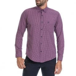 Ανδρικό πουκάμισο DORS σε μωβ απόχρωση με καρό μοτίβο. Σε ίσια γραμμή, με μακριά μανίκια και κλασικό γιακά με κουμπάκια στις άκρες. Διαθέτει μία τσέπη στο στήθος και κλείνει με κουμπιά μπροστά.