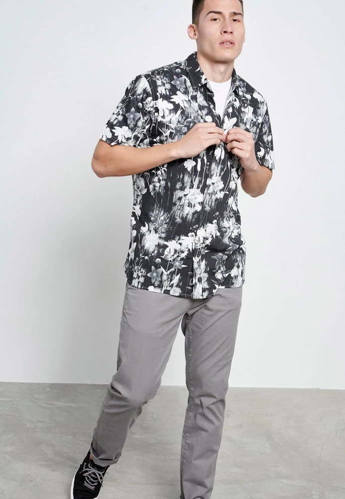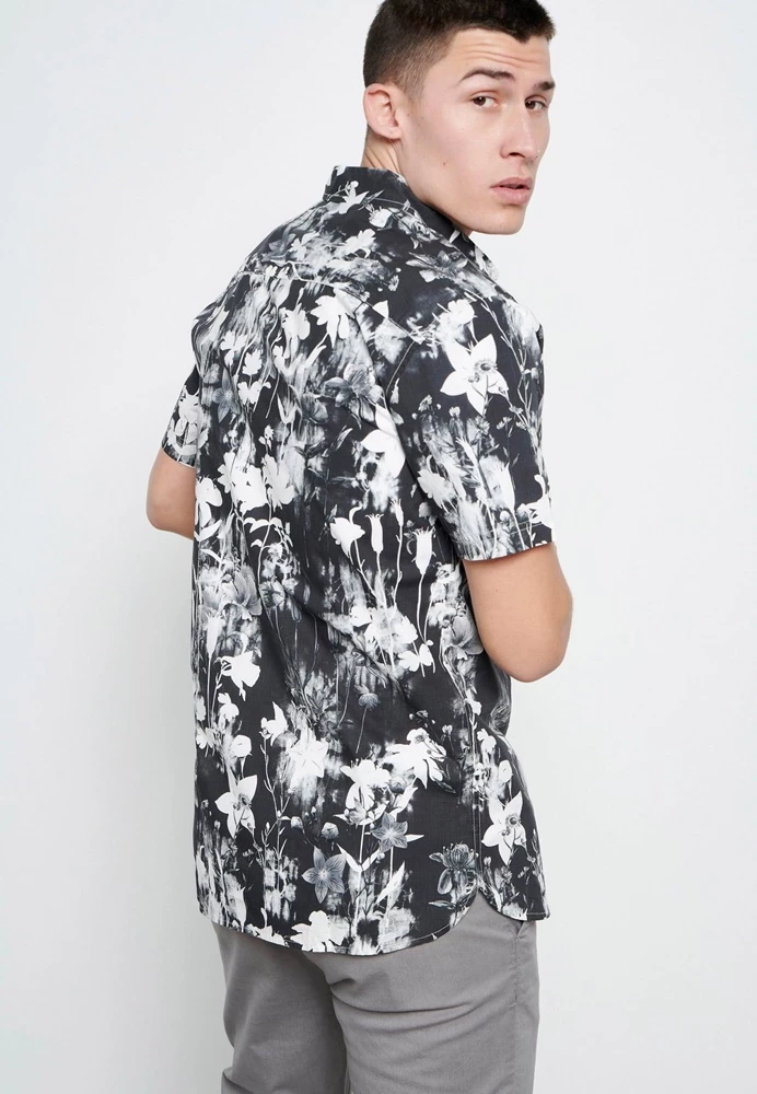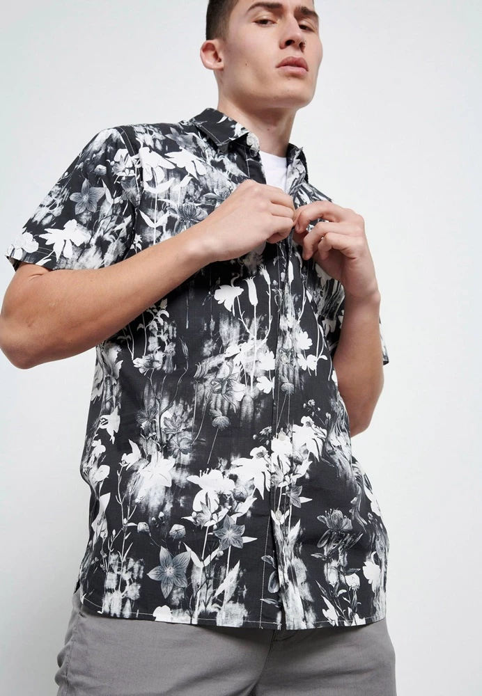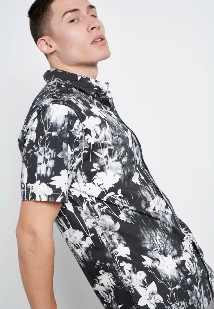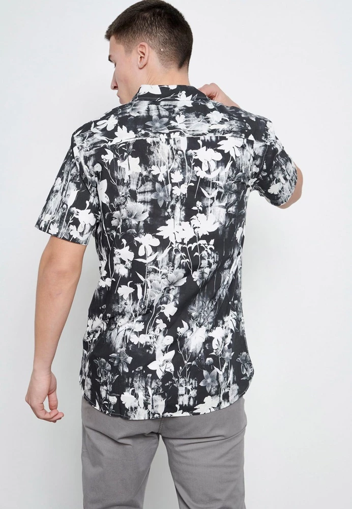 Ανδρικό κοντομάνικο πουκάμισο FUNKY BUDDHA ασπρόμαυρο, με floral τυπωμένο μοτίβο σε όλη την επιφάνεια και μία τσέπη στο στήθος. Σε ίσια γραμμή, με κανονική εφαρμογή. Έχει κλασικό γιακά με ελεύθερες άκρες και κλείνει με κουμπάκια μπροστά.