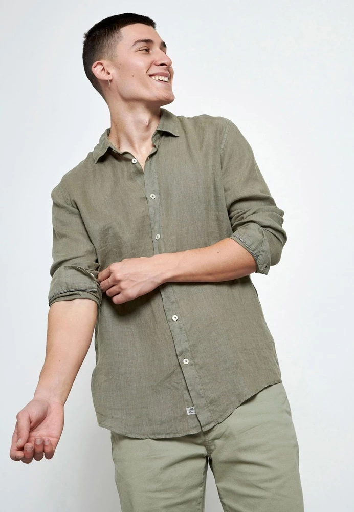 Ανδρικό λινό πουκάμισο FUNKY BUDDHA σε καφέ απόχρωση. Από βαμβακερή σύνθεση, σε ίσια γραμμή. Έχει μακριά μανίκια και κλάσικό button-down γιακά. Κλείνει με κουμπάκια μπροστά.