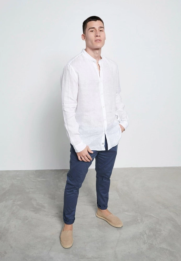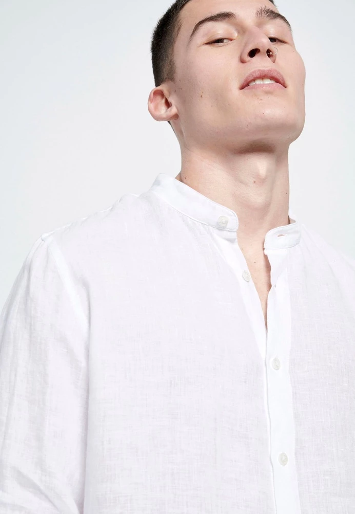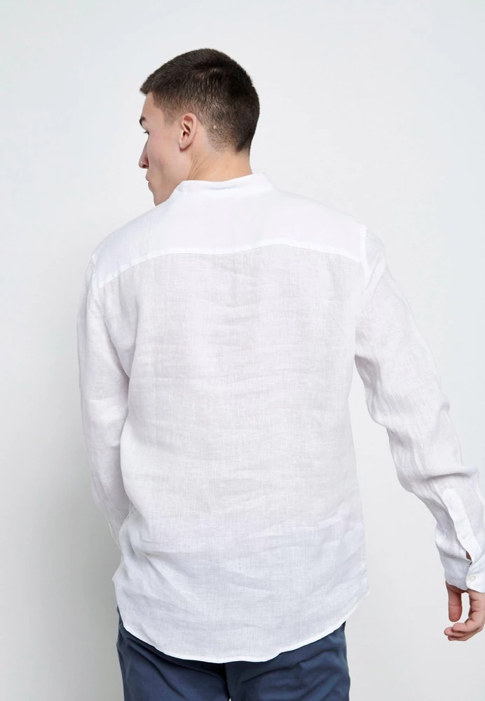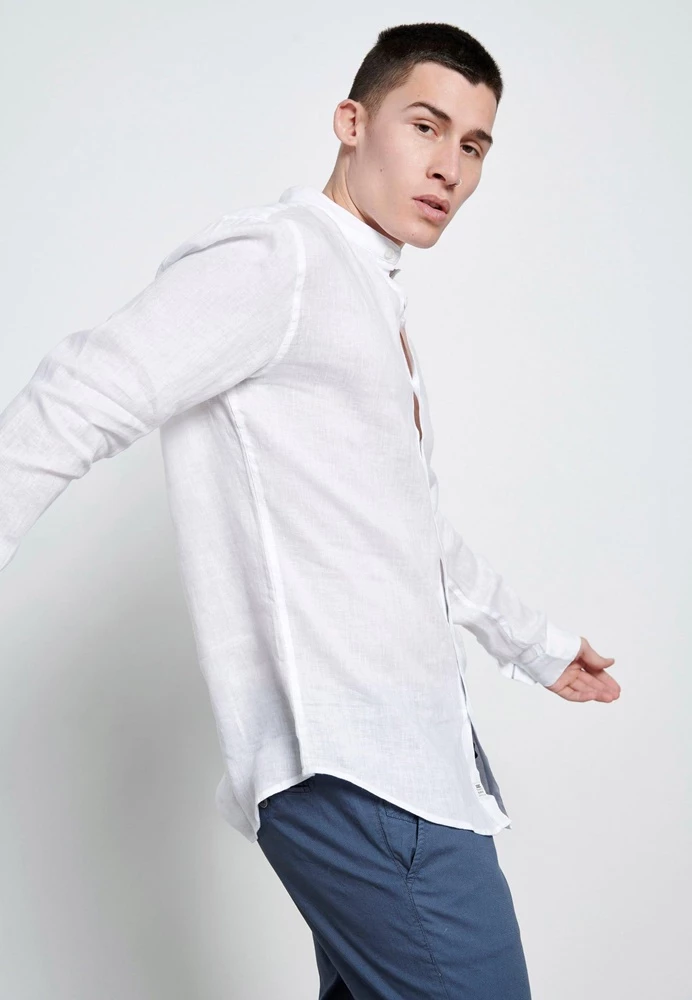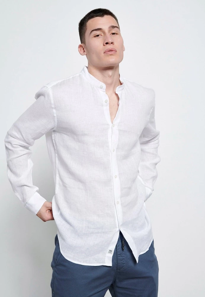 Ανδρικό λινό πουκάμισο FUNKY BUDDHA σε λευκό χρώμα. Από βαμβακερή σύνθεση, σε ίσια γραμμή. Έχει μακριά μανίκια και mao γιακά. Κλείνει με κουμπάκια μπροστά.