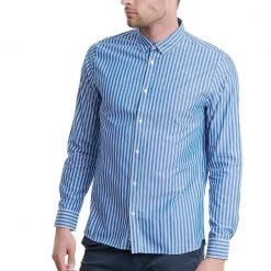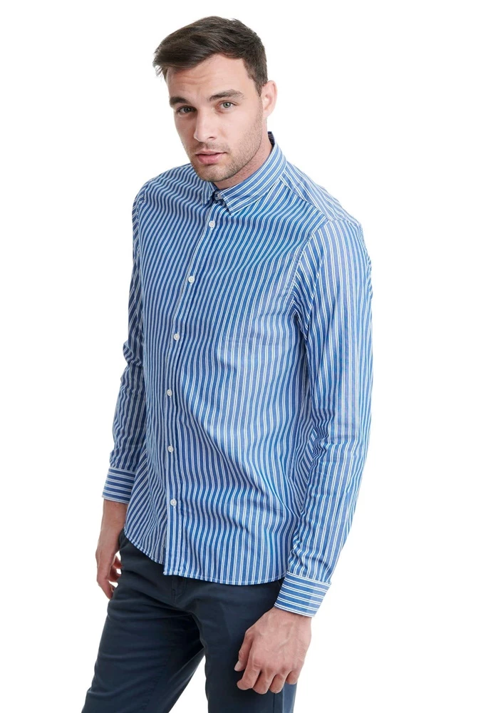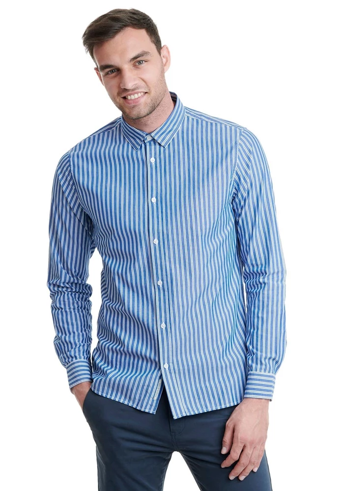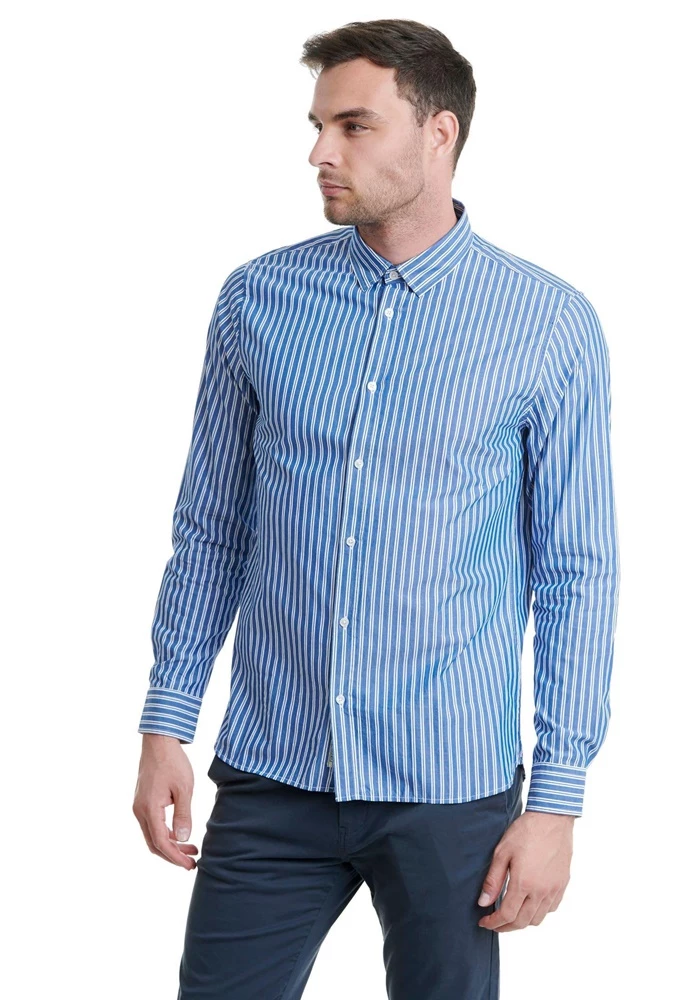 Ανδρικό μακρυμάνικο πουκάμισο ποπλίνα FUNKY BUDDHA σε γαλάζιο χρώμα με ρίγες. Έχει κανονική γραμμή και κλασικό γιακά
