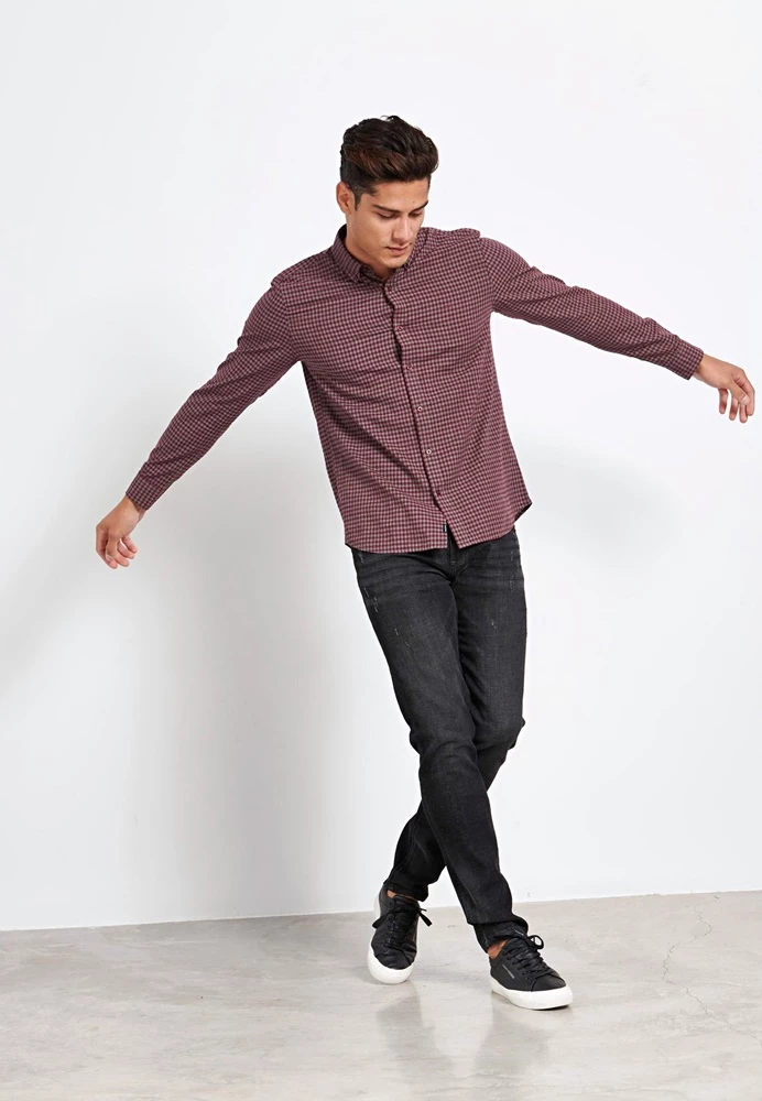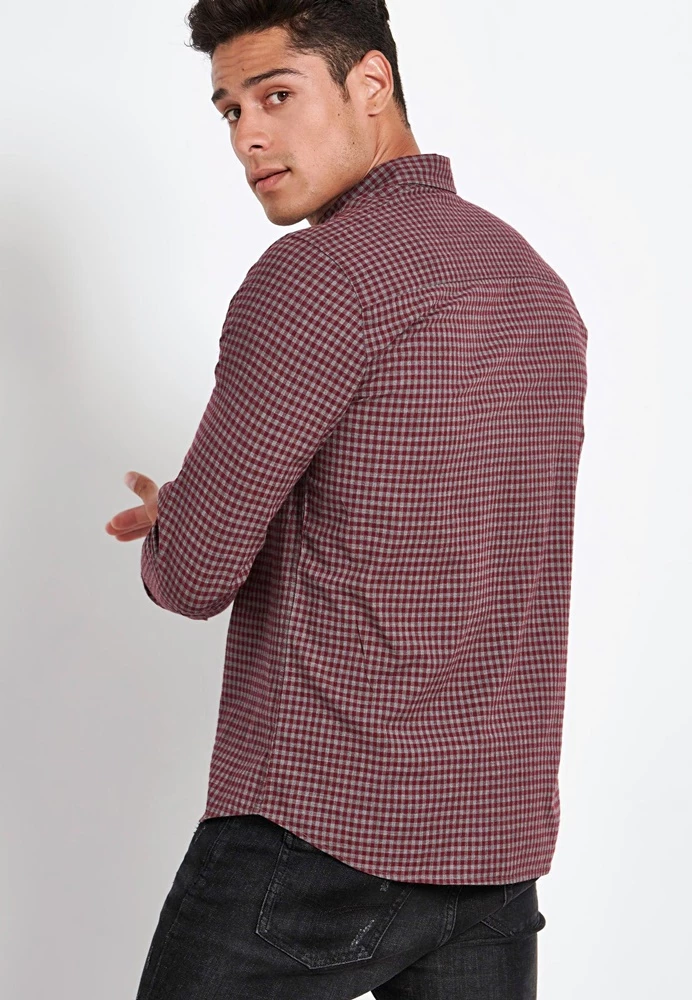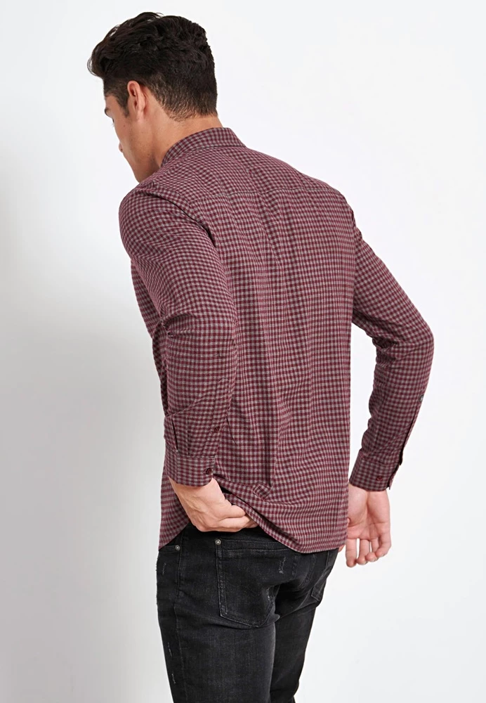Ανδρικό μακρυμάνικο πουκάμισο FUNKY BUDDHA σε κόκκινο χρώμα, με καρό μοτίβο. Έχει κανονική γραμμή και κλασικό γιακά.