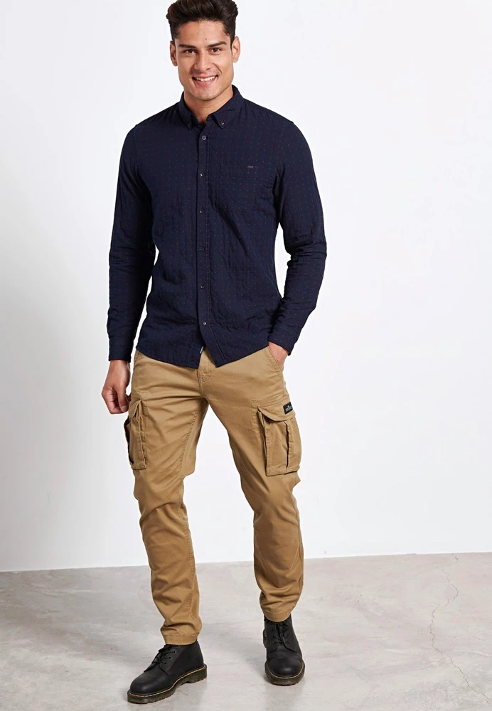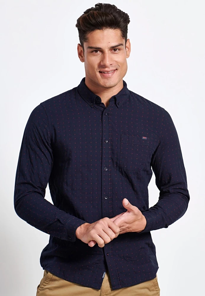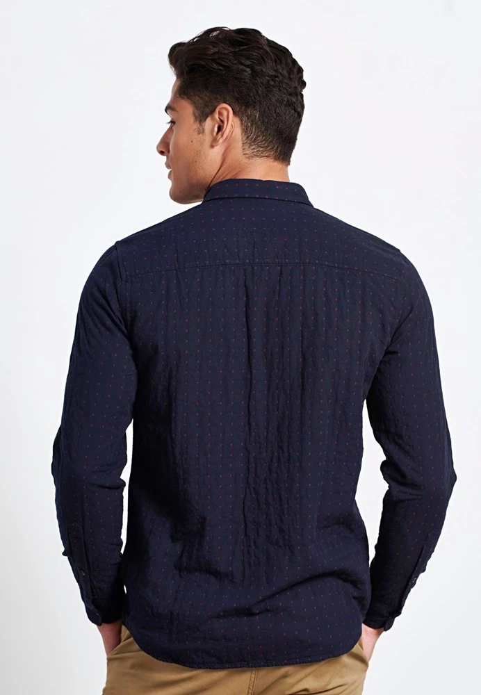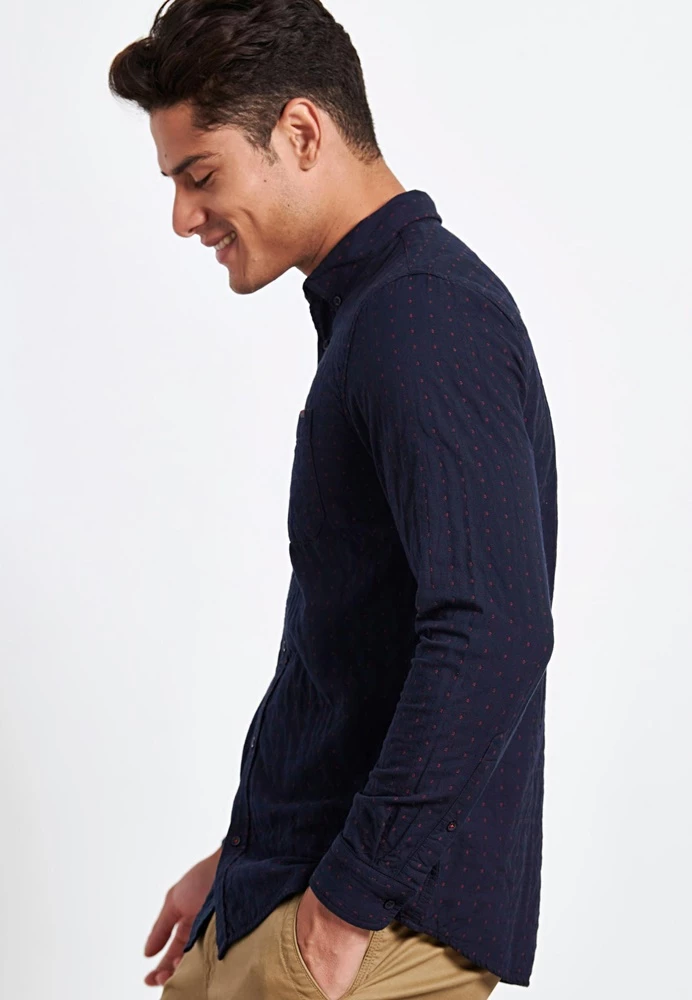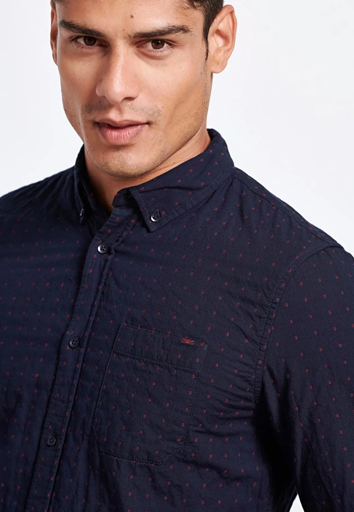 Ανδρικό μακρυμάνικο πουκάμισο FUNKY BUDDHA σε μπλε απόχρωση all over μοτίβο. Έχει κλασσικό γιακά Αποτελεί ιδανική επιλογή για casual chic εμφανίσεις.